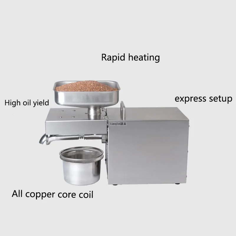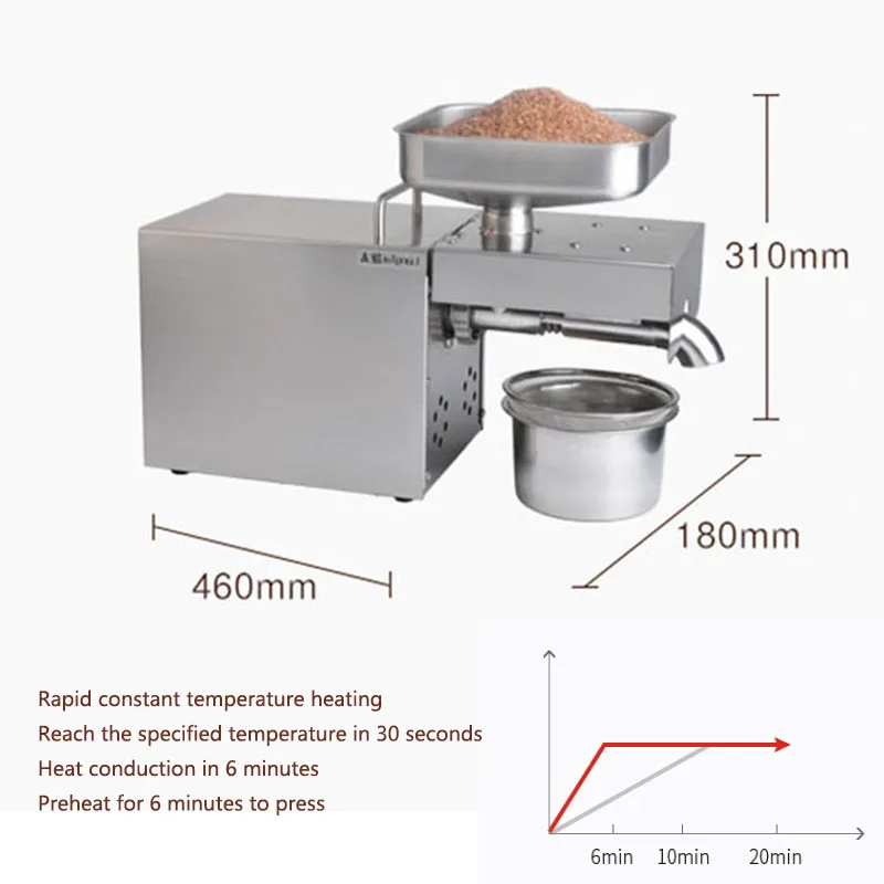 Это одна многофункциональная домашняя машина для прессования масла (машина для холодного пресса), вы также можете использовать ее для малого бизнеса. Вы можете использовать эту машину для прессования практически всех видов семян, таких как миндаль, аргановое зерно, черный тмин, семена камелии, семена рапса (семена рапса), семена Кастора, семена ЧИА, кокосовые чипсы или кокосовые хлопья, Семена хлопка, зародыши кукурузы, съедобные фиолетовые семена периллы, семена льна (лен Абердин), семена травы, семена конопли, семена ятрофы, семена жожоба, семена киви, семена Моринги, семена неема, семена окуры, арахис, перец (сухой), ядро кедрового ореха, семена платиклади, семена колючей золы, семена тыквы, семена шиповника, Семена сафлора, шизандра, кунжут (черный кунжут и белый кунжут), соя, семена подсолнечника, орех и орехи макадамии. Высокая скорость извлечения масла, вы можете получить 400 г масла из арахиса 1000 г. Простота в эксплуатации (руководство на английском языке) и может быть непрерывной работой без вздутия или перегрева. Мини-пространство и низкий уровень шума. Длительный срок службы, более 10 лет для домашнего использования. Дополнительные характеристики напряжения: европейский стандарт-220 В/стандарт США 110 В