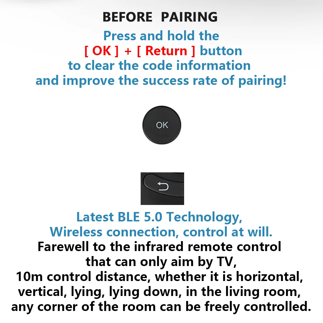 Нажмите и удерживайте кнопку OK + Return, чтобы очистить информацию о коде и улучшить коэффициент успеха сопряжения Новейшая технология BLE 5,0, беспроводное соединение, Управление по желанию. Попрощайтесь с инфракрасным пультом дистанционного управления, который может прицелиться только по телевизору, расстояние управления 10 м, будь то Горизонтальное, вертикальное, лежа, лежа, в гостиной, любой угол комнаты можно свободно контролировать.