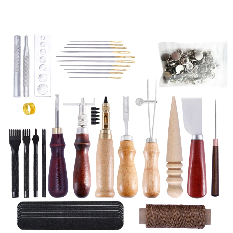 Название: Набор для ремонта кожи Материал: нержавеющая сталь + дерево + вощеная нить Тема: Набор для ручного шитья из кожи Использование: для начинающих Кожа ремесло Шитье Тип: набор инструментов для шитья кожи Особенности 1: Ручное шитье, шитье, штамповка Feature2: кожаные аксессуары Особенности 3: набор кожаных ручных строчек Feature4: инструменты для восковых нитей