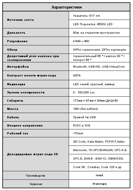 В режиме Инвентаризация (режим терминала сбора данных) может обработать до 35000 наименований товара. Радиус действия до 80 м на открытом пространстве. До 8 часов работы без подзарядки. Технология беспроводной связи - радио 2,4GHz или Bluetooth. При работе с ККТ ПОРТ сканер «не засыпает» (не выключается), если его временно не используют. Подключается к классическим онлайн-кассам, веб-кассам и к другим кассам по технологии AПK (программные кассы). Может работать с ККМ, с ПК, с планшетами и смартфонами. Читает не только коды 1D и 2D, но и QR-коды для оплаты, в том числе с экрана телефона. Поддерживает русский набор символов. Работает с Портall - сервисом для работы с номенклатурой и маркировкой.
