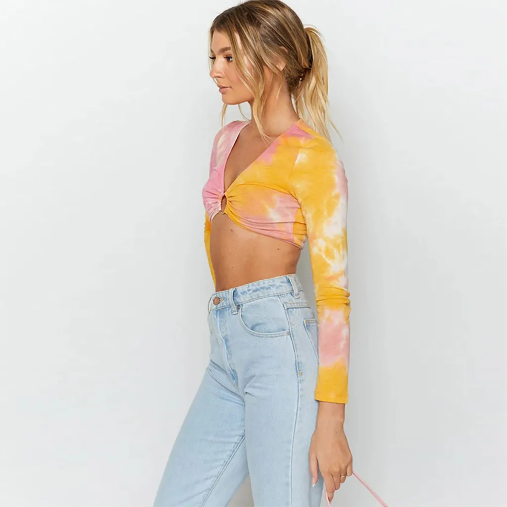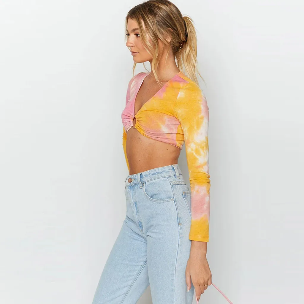 Модная женская повседневная короткая футболка с v-образным вырезом и пуговицами, облегающие топы с длинными рукавами