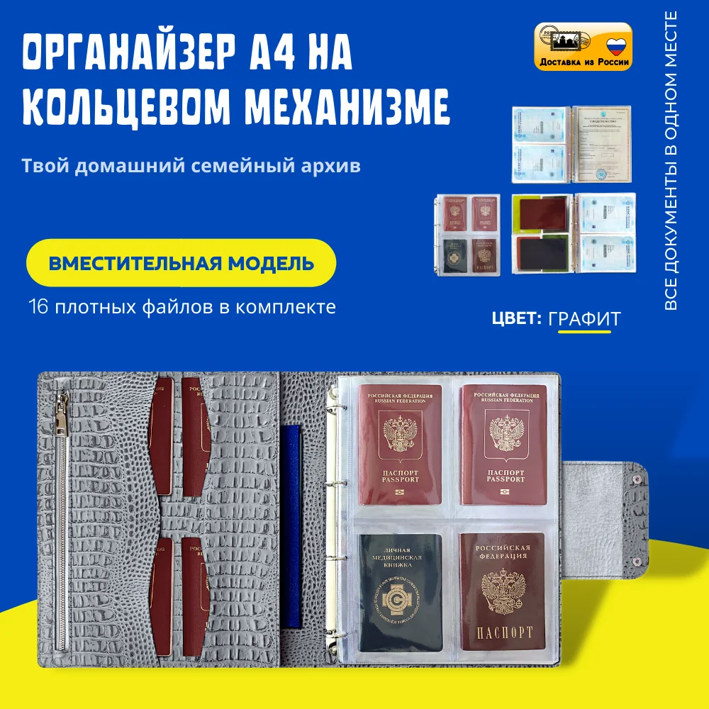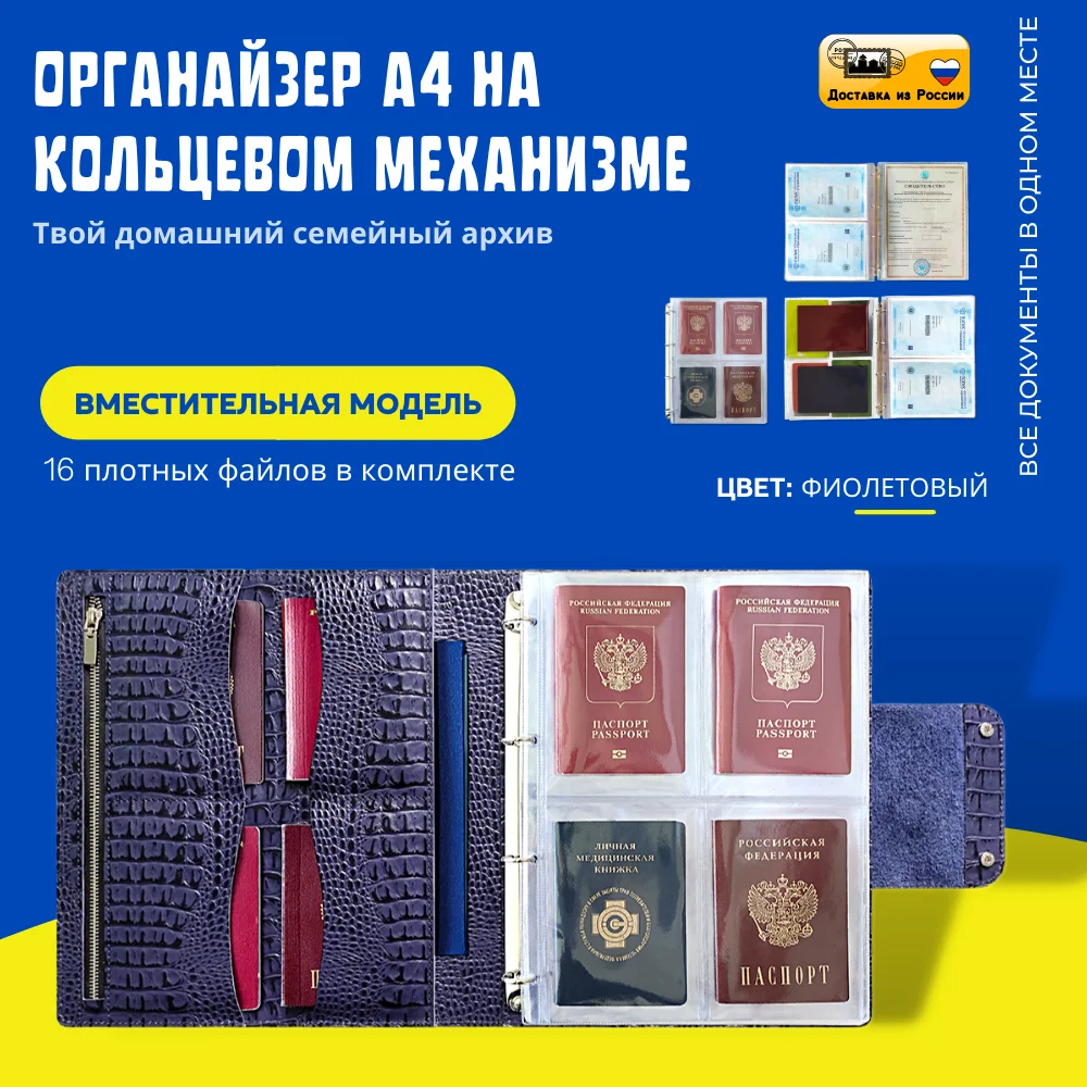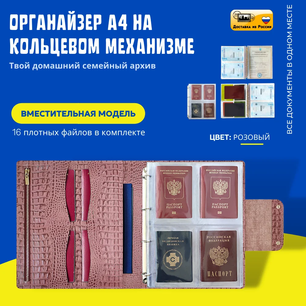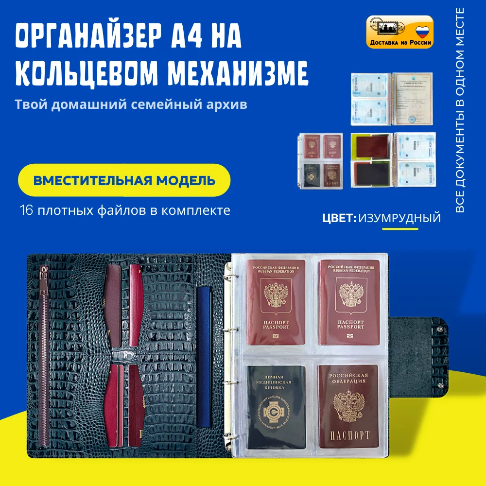 - 3 плотных вкладыша формата А4 на 4 кармана для паспортов, СНИЛС, медицинских книжек или других документов формата А6;