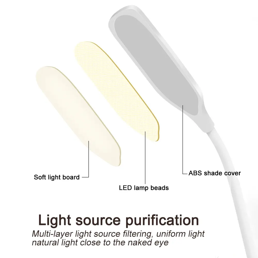 Перед использованием настольной лампы необходимо отрегулировать базовый переключатель в направлении вкл. Переключатель настольной лампы является трогательным переключателем. Режим работы сенсорного переключателя: короткое нажатие один раз на белый светильник, прикосновение один раз на теплый светильник, Длительное нажатие на плавное затемнение, возможность сохранения яркости