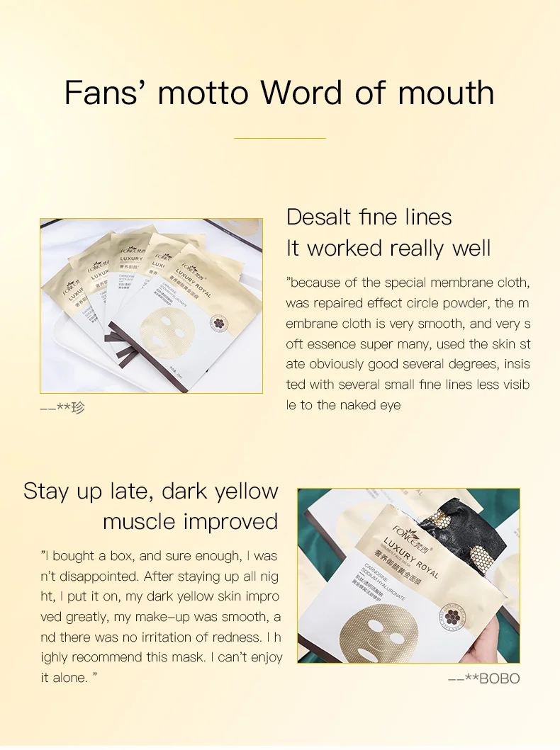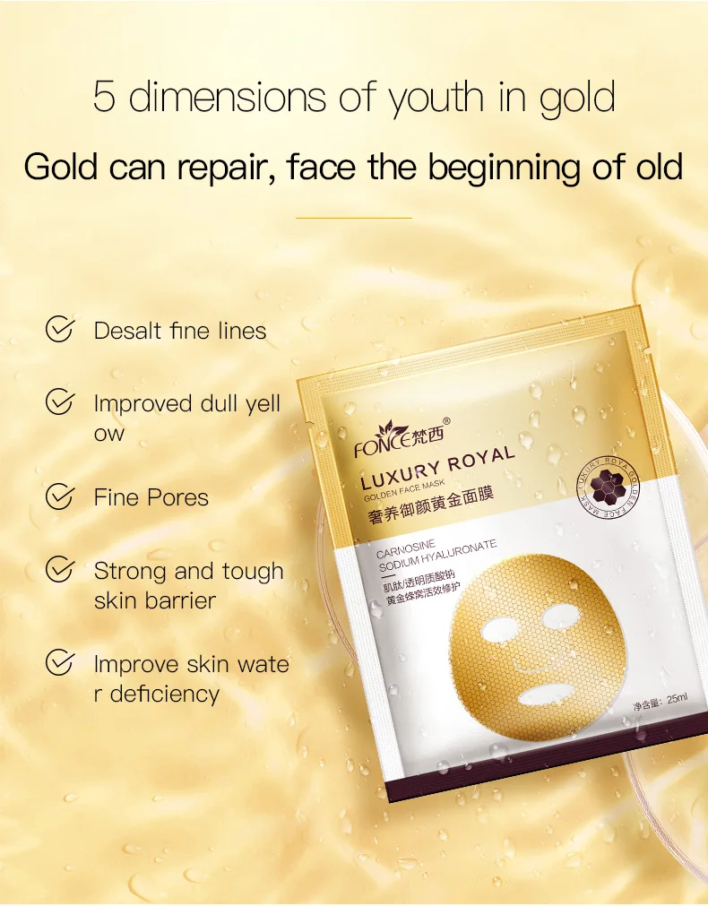 Eywords: увлажнение, восстановление, осветление тона кожи, укрепляющие линии, защита от гликации Место происхождения: Китай Содержание нетто: 5 шт. Срок годности: 2 года Введение продукта: двухслойная Золотая мембрана с Сотами, внутренние и внешние слои питания, содержащие гиалуронат натрия, золото и Карнозин и другие ингредиенты, увлажняющую эссенцию, с мягким ремонтом, увлажнением, улучшение кожи и других проблем с кожей, длительное использование, помогает коже быть полной и упругой, сияющей. Основные ингредиенты: гиалуронат натрия, Карнозин, Золотая фольга, экстракт листьев центеллы азиатии, дикалий глициризинец (экстракт лакрицы), экстракт корня хризантемы матери, керамид 3, никотиамид