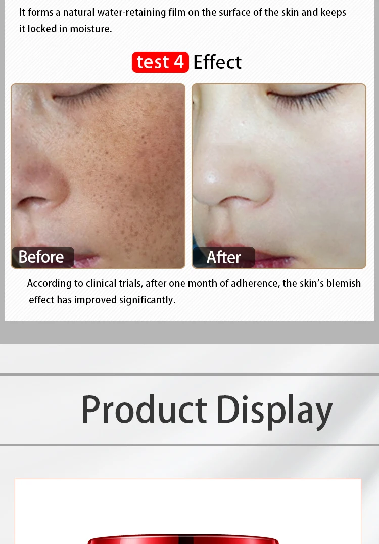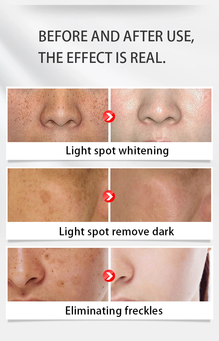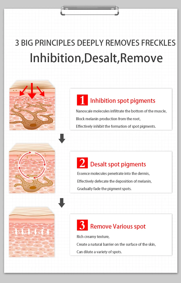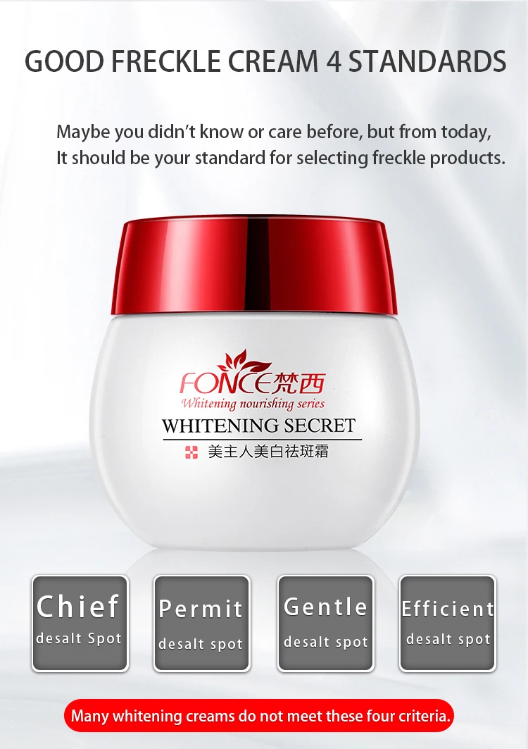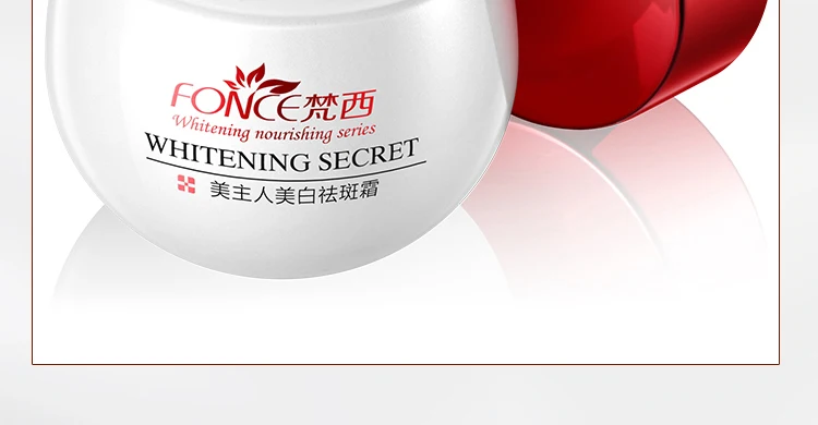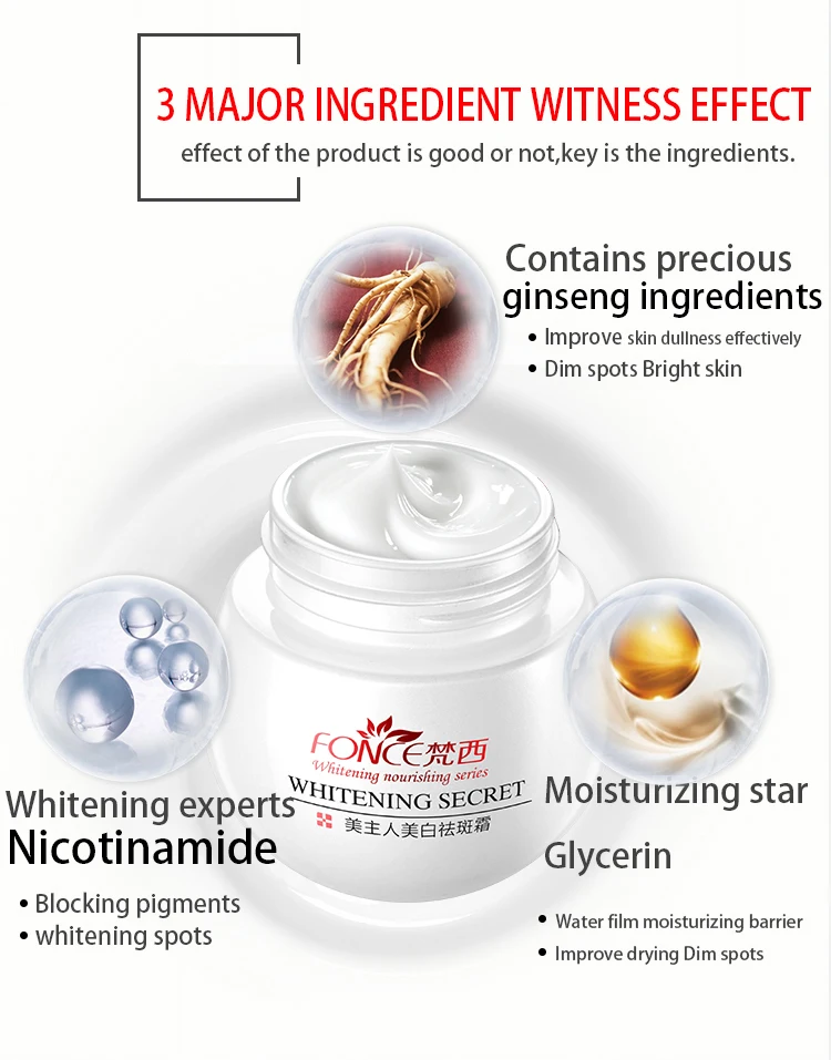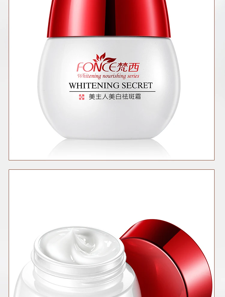 Freckles Whitening Cream Strong Reduces Age Spots anti Freckles Fade Dark Spot treatment freckles Facial Moisturizer Serum 30g [Product Name] Fonce Freckle whitening cream [key words] face cream, moisturizing, remove dark spots, whitening, facial skin care,repair skin, whitening cream, moisturizing skin, whitening serum [Net] 30gx1 [Origin] China [Principal] Korea Fonce Cosmetics Co., Ltd. [Product Main ingredient] Ginseng plant extract Nicotinamide 3-4% Glycerin component [ ingredient ] Water, glycerin, triglyceride of palmitic acid, ethylhexyl palmitate, butanediol, cetearyl alcohol, iso-iso-isovalide, Cetearyl glucoside, ascorbyl glucoside, niacinamide, polydimethylsiloxane, ginseng extract, grape fruit extract, hydroxyethyl cellulose, Tocopherol acetate, panthenol, bisabolol, allantoin, methylparaben, disodium EDTA, hydroxyphenylpropanol, flavor [Efficiency] Ginseng plant extract effectively improves skin dullness Lighten spots, brighten skin Nicotinamide decomposed into melanin pigmentation Glycerin moisturizing ingredients eliminate dry skin [Using method] 1:Clean the face 2:Take proper amount of cream 3:Apply evenly to the face, gently message until to be absorbed 4:Follow-up skin care maintenance Time to market: 2020 Limited-use date range: 2020-07-23 to 2022-07-25 Notice: 1. Please test on the arm before use. If there is any adverse reaction, please stop using it, then contact us to solve the problem. 2, under normal circumstances, the use of about 1 week will have an effect, if your radiation spots, freckles, yellow spots are very serious, it is recommended that you buy 3 bottles for a cycle of use. 3.Apply directly to the spots and it is recommended to use them separately at night.