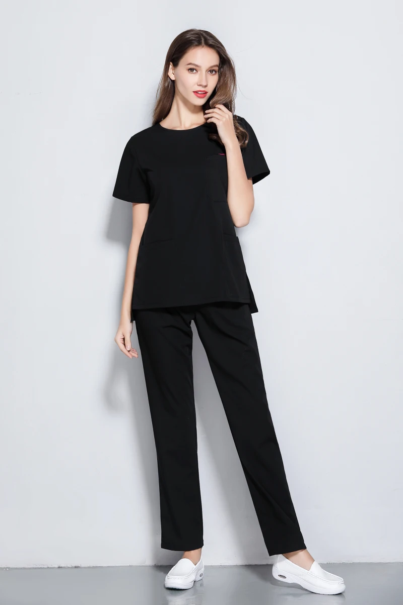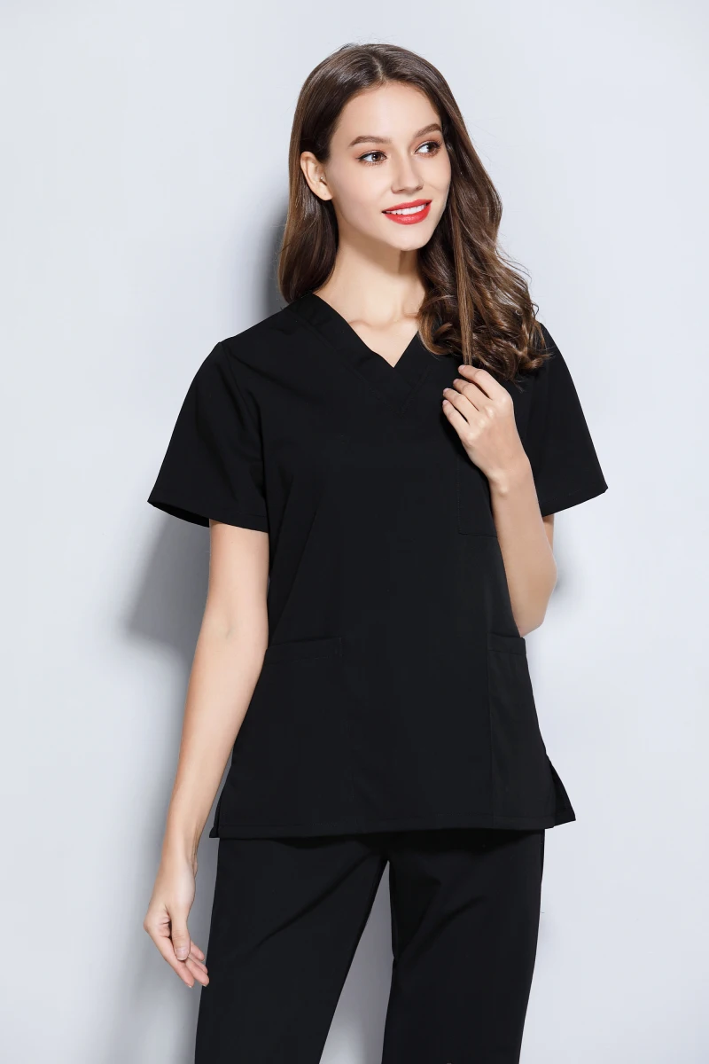 Women's working uniform Application: widely used in hospitall We can add company and safety LOGO on the garment according to customer request Color: black color in different design Material: 70/30 polyester/rayon Inner Lining: no inner lining Applied seasons: Spring and summer Features: 1) washable 2) Good quality and sewing 3) New design Below is uniform size spec : (Model 175CM 48KGS , bust/waist/hip=84/61/84CM , wearing size "S")