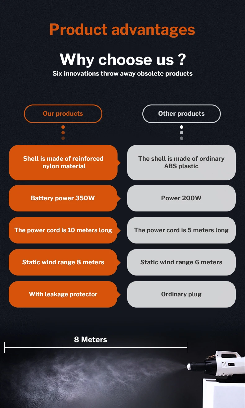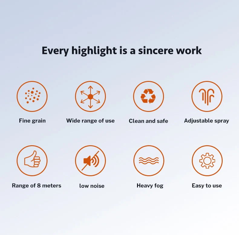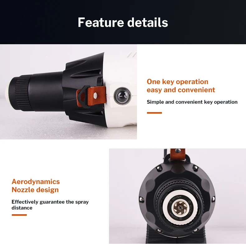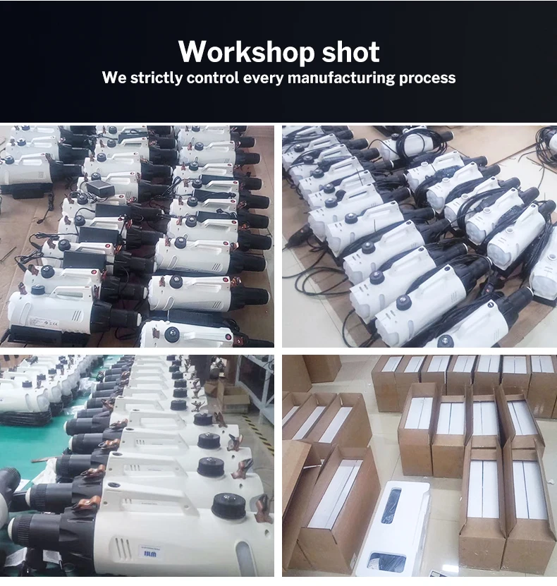 1. Мощность: 1350 Вт 2. Емкость жидкости: 2л 3.W | orking температура :( 0-40)℃ 4. Размер капель: 10мкм, 30мкм, 50мкм 10μm насадка: 60 мл/мин. 30μm сопла: 100 мл/мин. 50μm сопла: 220 мл/мин. 5. Эффективный диапазон: 10 м 6. Потребляемая мощность: 220-240 В 50 Гц/60 Гц 7. Вес нетто/вес брутто: 4 кг/4,3 кг 8. Размер: 520 мм * 1420 мм * 230 мм