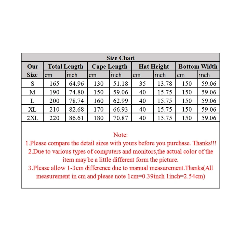 Размер: 2XL Общая длина: 220 см (86,61 дюйма) длина накидки: 180 см (70,86 дюйма) высота шляпы: 40 см (15,74 дюйма) ширина подошвы: 150 см (59,05 дюйма)