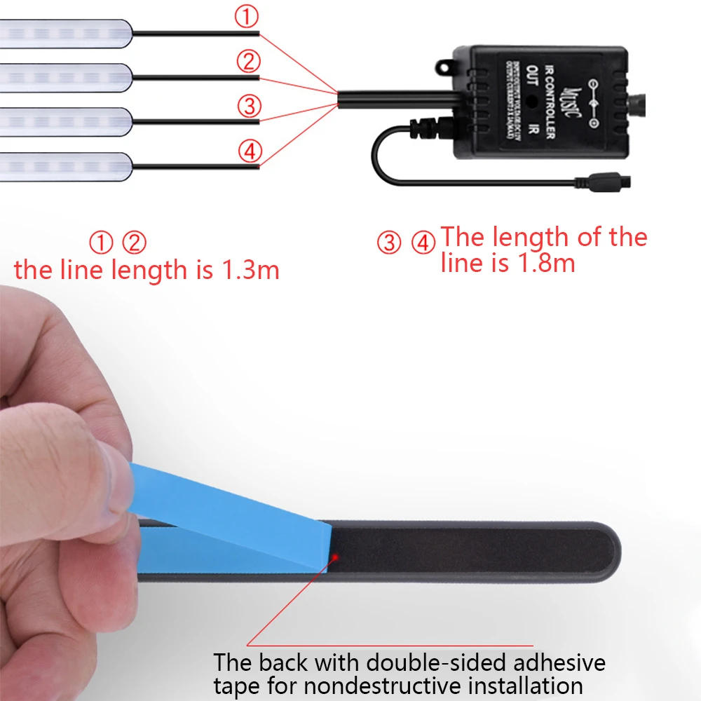 1,4 В 1 ABS автомобильный интерьерный светильник:Это 4 в 1 интерьер автомобиля USB светильник полосы, в том числе 2*1,3 м и 2*1,8 m кабель, который может быть вставлен в идеальное положение в машине. Этот автомобильный светодиодный светильник изготовлен из высококачественного АБС-пластика, который может быть согнут, чтобы сделать его более подходящим для вашего автомобиля, и его легче установить, лучше и прочнее.