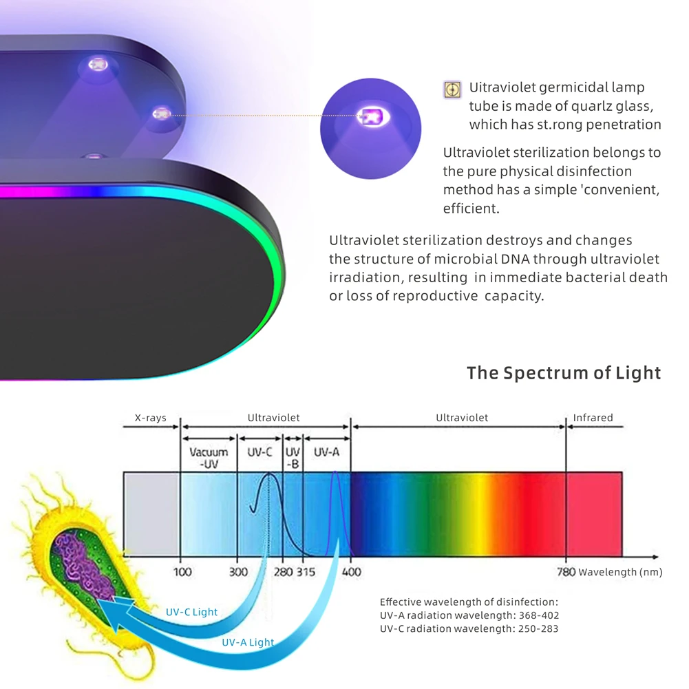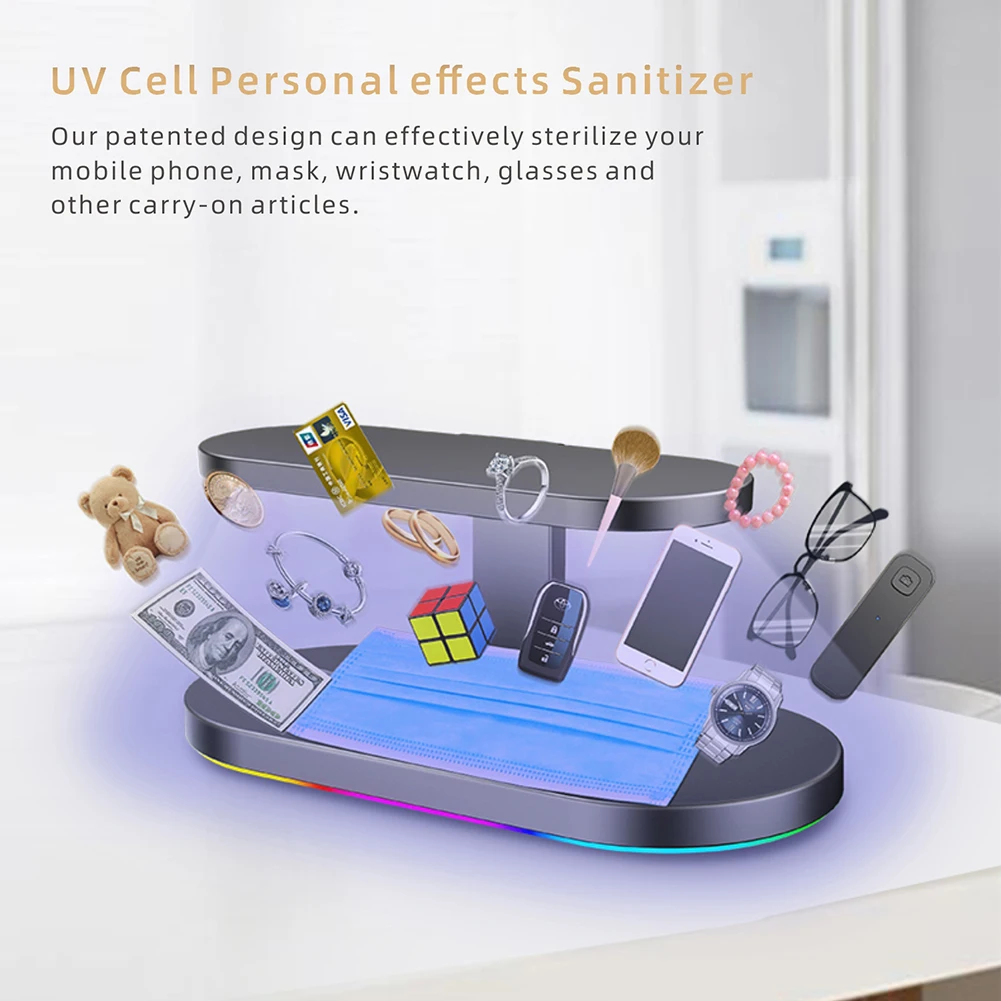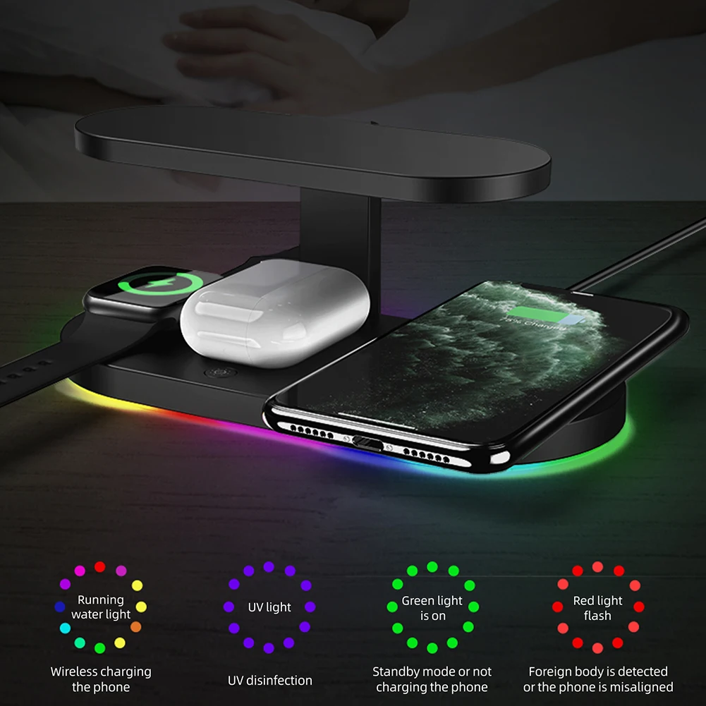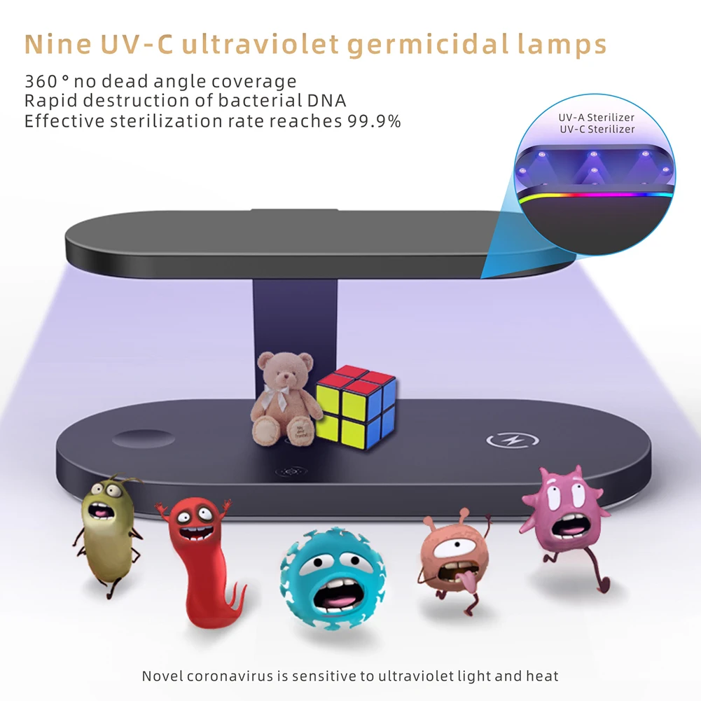 -Беспроводное зарядное устройство может использоваться не только в качестве беспроводного зарядного устройства, но и в качестве УФ-пылесоса с прочной УФ-трубкой C, которая может полностью очистить эти 3 устройства в течение 3 минут после зарядки. И это дает простой способ держать ваши устройства в чистоте.