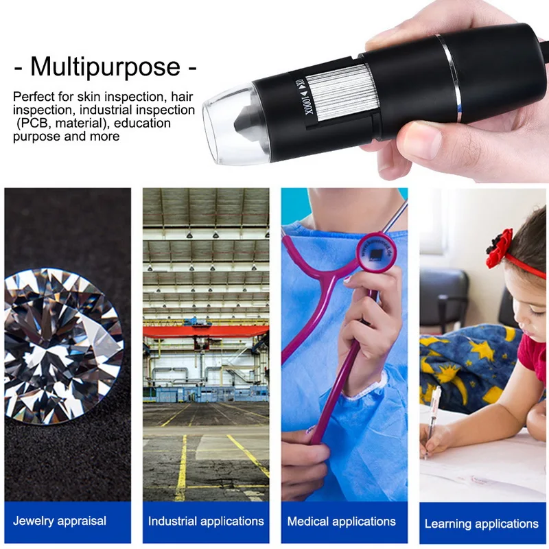 -- Многоцелевой -- идеально подходит для осмотра кожи, осмотра волос, промышленной инспекции (PCB, материал), образовательных целей и многого другого.