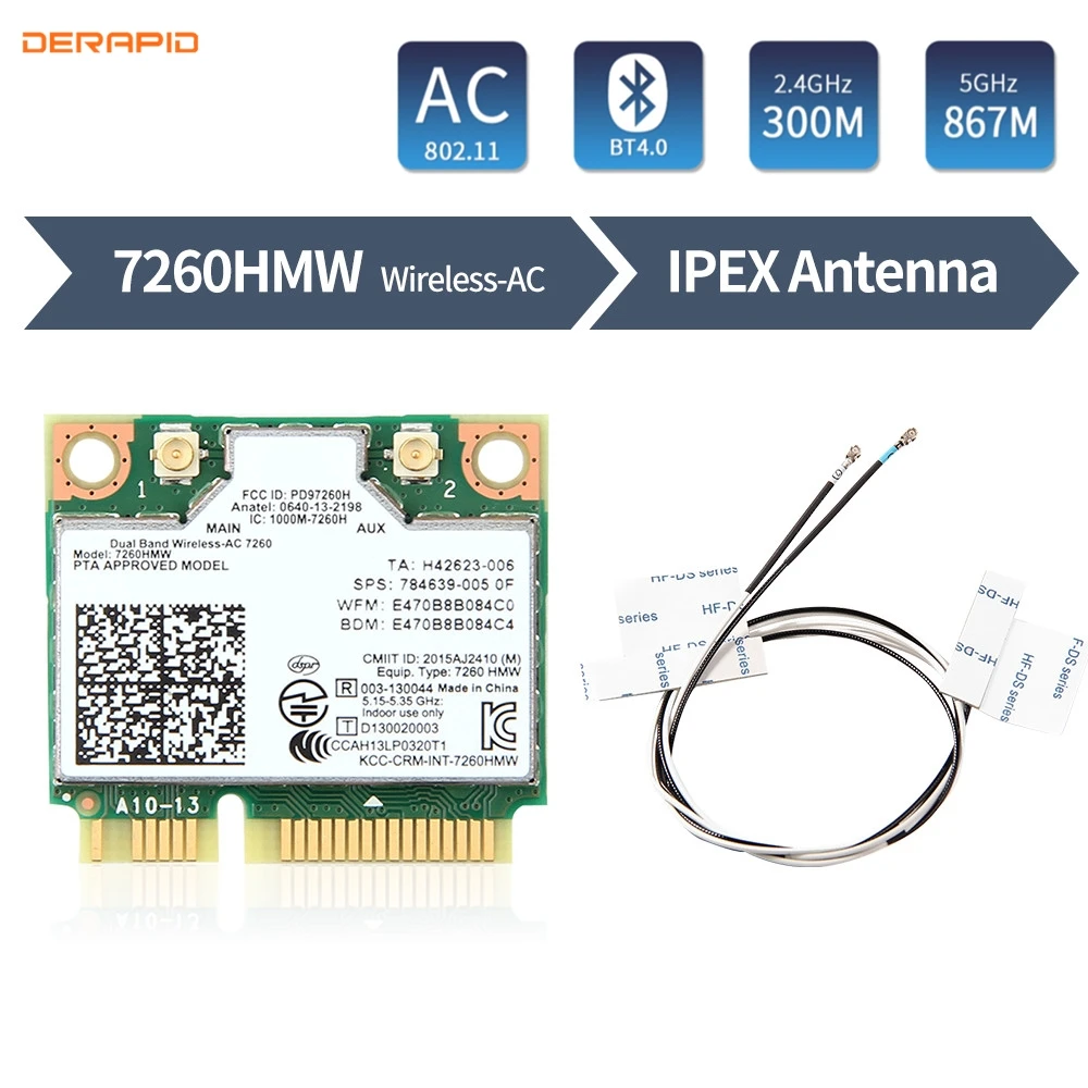 Модель: 7260HMW Интерфейс: Mini PCI-E Диапазон частот: Dual band 2,4 ГГц/5 ГГц Скорость: до 867 Мбит/с Сеть Стандартный: 802.11a/b/g/n/ac Версия Bluetooth: 4,0