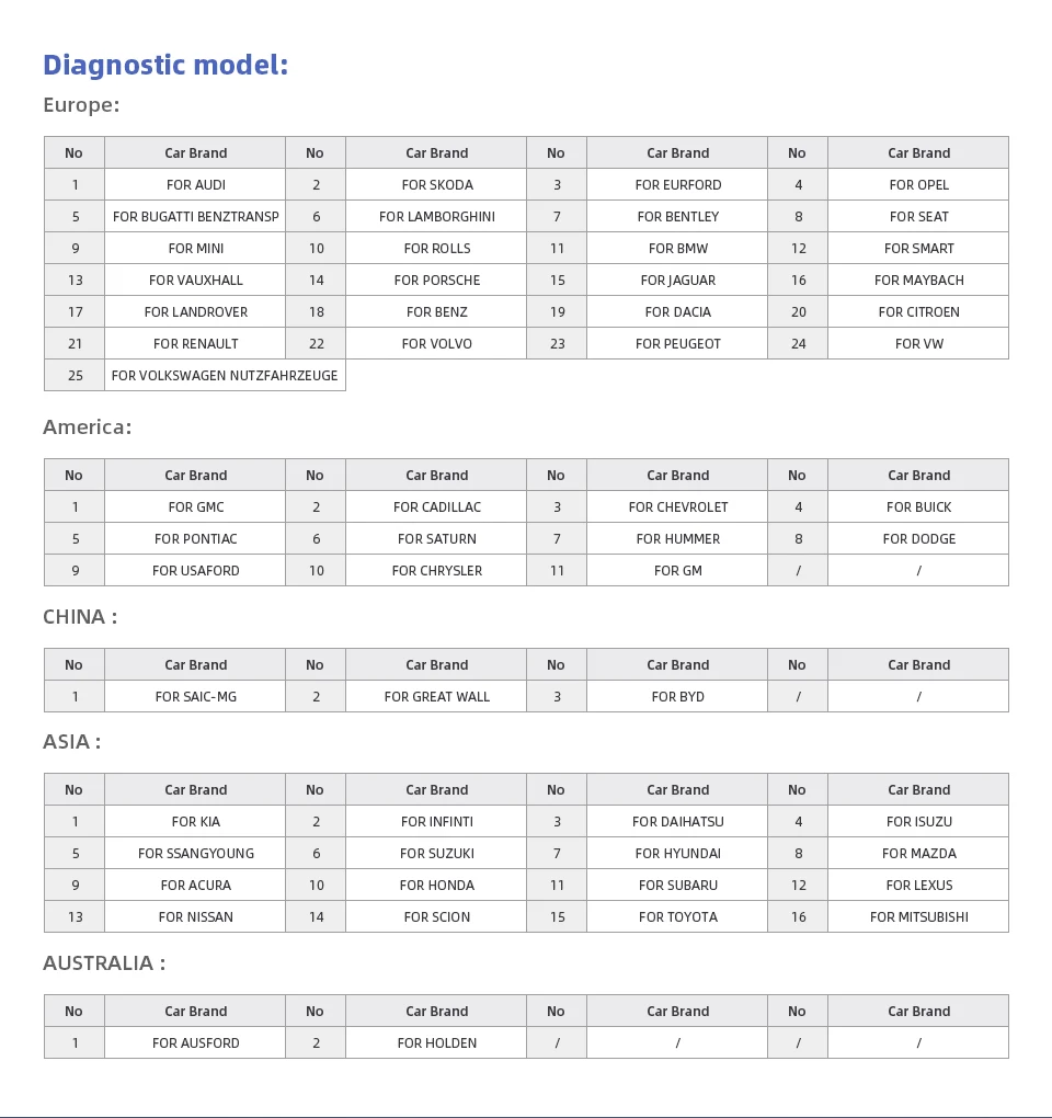 Европа Для Audi, для Skoda, для EurFORD, для Opel, для Bugatti BenzTRANSP, для Lamborghini, для Bentley, для SEAT, для MINI, для рулонов, для BMW, для SMART, для VAUXHALL, для PORSCHE Для JAGUAR, для Volkswagen Nutzfahrzeuge, для MAYBACH, для LANDROVER, для BENZ, для DACIA, для CITROEN, для RENAULT, для VOLVO, для PEUGEOT, для VW Америка Для GMC, для CADILLAC, для CHEVROLET, для BUICK, для PONTIAC, для SATURN, для HUMMER, для DODGE, для USAFORD, для CHRYSLER, для GM Китай Для SAIC-MG, для GREAT WALL, для BYD Азия Для KIA, для INFINTI, для DAIHATSU, для ISUZU, для SSANGYOUNG, для SUZUKI, для HYUNDAI, для MAZDA, для ACURA, для HONDA, для SUBARU, для LEXUS, для NISSAN, для SCION, для TOYOTA, для MITSUBISHI Австралия Для AUSFORD, для HOLDEN