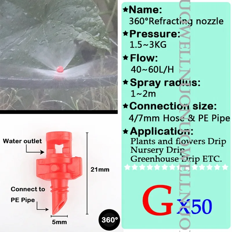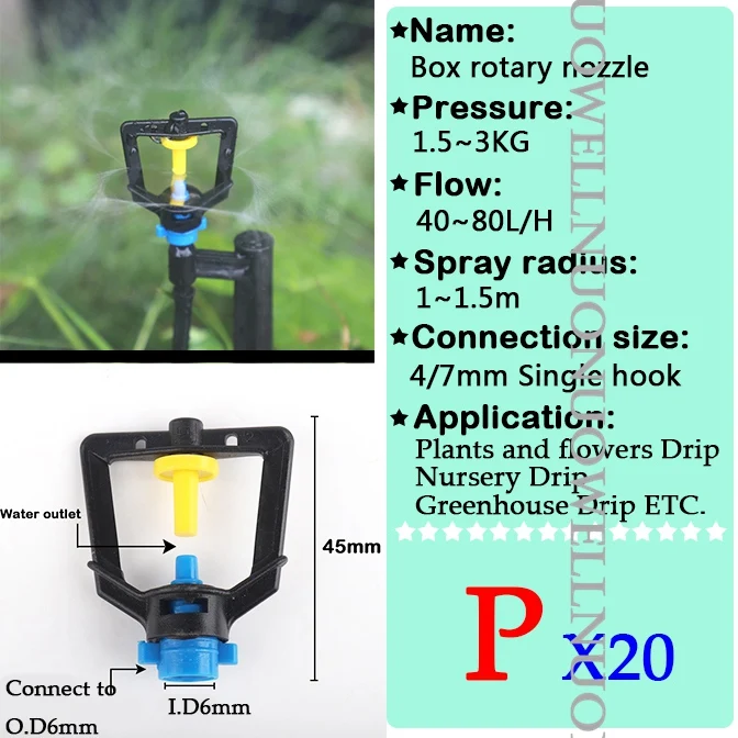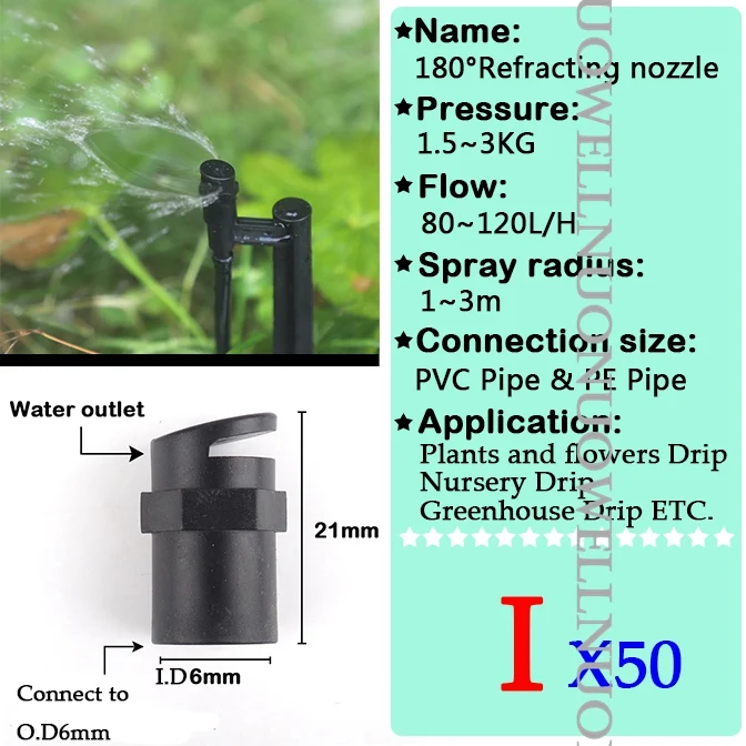 -Название: сопло для преломления -Материал: PP пластик -Поток: 0 ~ 150 л/ч -Спрей радиус: 0 ~ 4,5 м -Рабочее давление: 1 ~ 3 кг -Применяется для: 4/7 мм шланга и PE трубы -Применение: ①Garden для полива и орошения ②Фрукты дерево и овощи орошение ③ Капельное орошение в питомнике ④Охлаждение животноводства и т. Д.