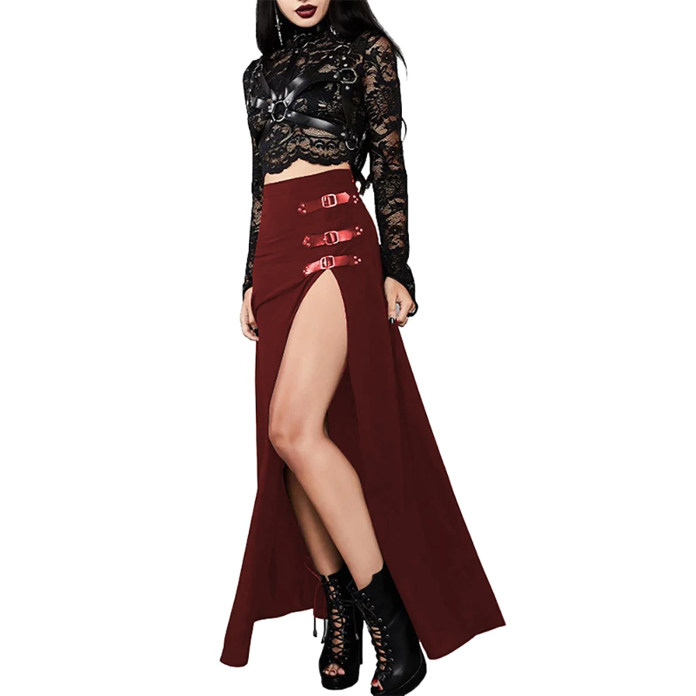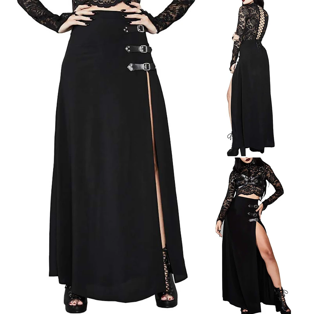 Готическая Женская однотонная длинная юбка до щиколотки с разрезом сбоку и высокой талией, уличная одежда