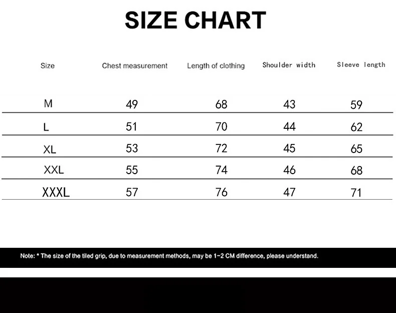 1. Поскольку форма тела каждого человека отличается, рекомендуемый рост и вес могут использоваться только в качестве справочной информации. 2. Если ваш рост и вес между 2 размерами, пожалуйста, выберите больший размер. 3. Если вы не уверены, какой размер выбрать, пожалуйста, свяжитесь с нами. 4. Информация о размере измеряется вручную, и возможна погрешность в 1-2 см. 5. Из-за световых эффектов, настроек яркости/контрастности монитора и т. д. могут быть некоторые незначительные различия в цветовом тоне фотографий и фактического товара! 6. Посылка включает: 1 шт. х куртка