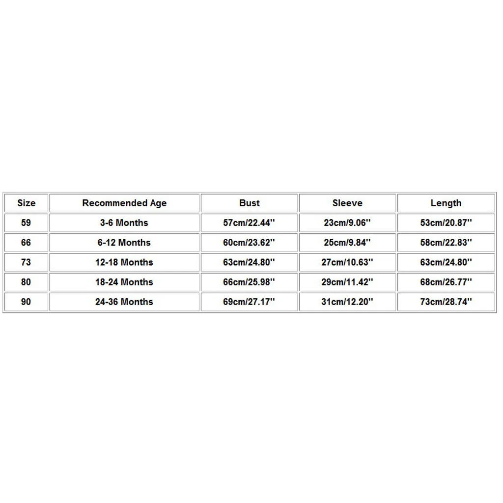 Размер Рекомендуемый возраст Обхват груди Рукава Длина 59 С диагональю экрана 3-6 месяцев 57 см/22,44'' 23 см/9,06'' 53 см/20,87'' 66 6-12 месяцев 60 см/23,62'' 25 см/9,84'' 58 см/22,83'' 73 12-18 месяцев 63 см/24,80'' 27 см/10,63'' 63 см/24,80'' 80 18-24 месяцев 66 см/25,98'' 29 см/11,42'' 68 см/26,77'' 90 От 2 до 3 лет 69 см/27,17'' 31 см/12,20'' 73 см/28,74''