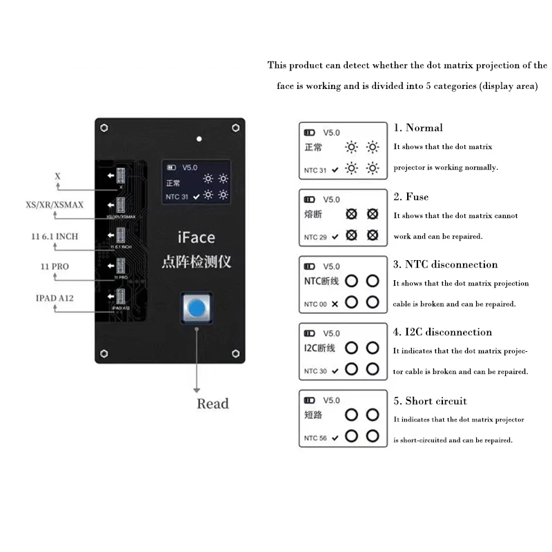 Особенности 1. Главный артефакт обнаружения 2. Легко поможет вам найти проблему с лицом к лицу. 3. Поддержка X/XS/Xr/Xsmax/11/11Pro и iPad A12.
