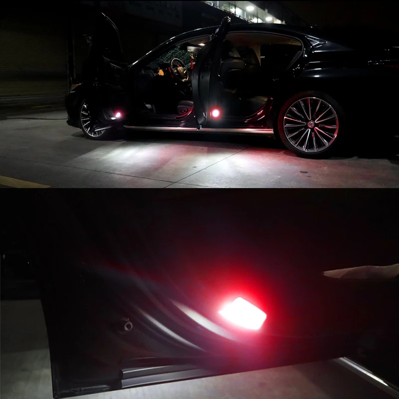 Red function:Side-Shine Strobe/Flashing white function:3 times brighter than the factory ones One pair (left/right sides) full LED assemblies, powered by 18 pieces super bright Two-color Red/white LED diodes (Replace OEM part # 81230-47010, 81230-02040, 81230-02050, 81230-48020) Directly replace the factory original side/under door step courtesy lamp housing/lens and the 168 194 or 6418 C5W light bulb inside These all new super bright 3-watt high power LED footwell accent illumination lighting assy are at least 3 times brighter than the factory ones, will give your car a modern and luxurious appearance with enhanced safety at night