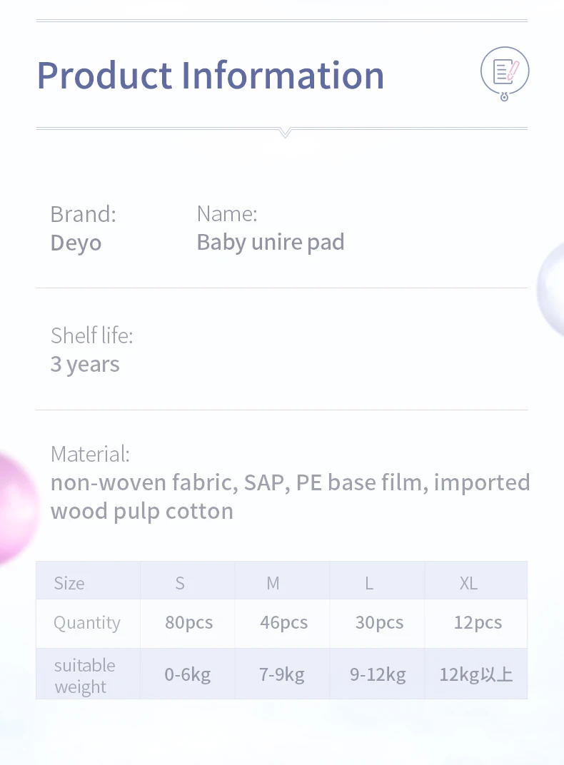 Особенности: 1. Высококачественный Ультра мягкий верхний слой сохраняет сухую и удобную поверхность. 2. Текстура алмаза полезна для быстрого распределения и поглощения жидкости. 3. Двойной абсорбирующий сердечник предназначен для быстрой и прочной фиксации жидкости. 4. Защита от утечки PE задняя пленка с дышащим дизайном защищает от утечки и герметичности. 5. Высокое качество слова бренда SAP и пух целлюлозы эффективно уменьшает неприятные запахи и предотвращает бактериальный рост. Информация о продукте: Сезон: четыре сезона Материал: полимерные абсорбирующие бусины, Нетканая ткань, Полиэтиленовая дышащая нижняя пленка, импортный хлопок из древесной массы Тип: детские одноразовые Подходит для ребенка, прост в использовании, безопасен для окружающей среды и здоровья. Характеристики: S : 80 шт./упак. * 2 пачки, 25*33 см, для детей возрастом от 0 до 3 месяцев Детские M : 46 шт./упак. * 2 пачки, 33*45 см, для 3-6 месяцев для малышей L : 30 шт./упак. * 2 упаковки, 45*60 см, для детей старше 6 месяцев Примечание: 1. Пожалуйста, учитывайте разницу в 1-2 см из-за ручного измерения. 2. Реальный цвет может немного отличаться от изображений из-за разрешения экрана компьютера, яркости, контрастности и т. д.