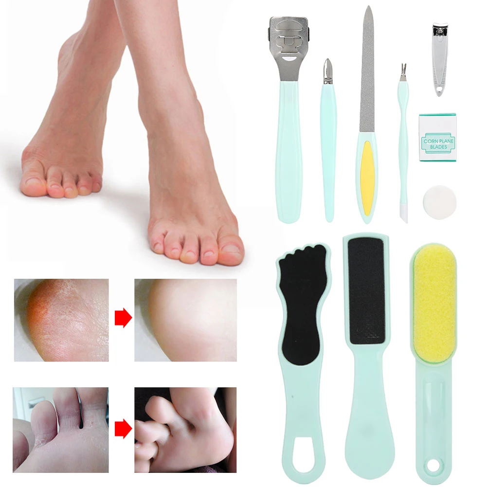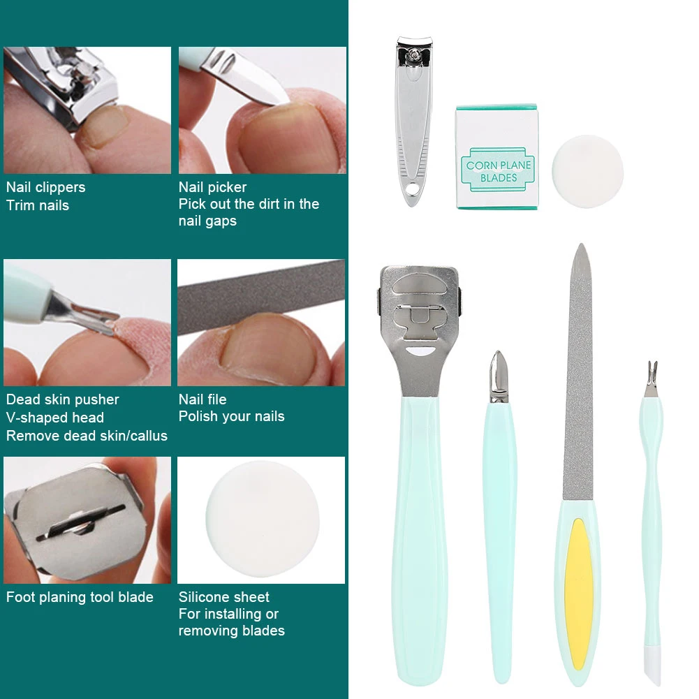 3 x средство для удаления мозолей ног 1 x пилка для ногтей 1 x Пикер для ногтей 1 x Толкатель для омертвевшей кожи 1 x инструмент для строгания ног 5 x ножной строгальный инструмент лезвия 1 x машинка для стрижки ногтей 1 x Силиконовая накладка