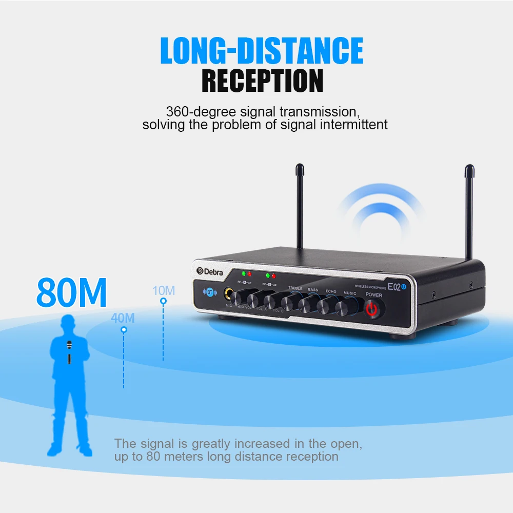 Debra E02U Профессиональная Беспроводная микрофонная система, 2 ручных устройства с Bluetooth и реверберами, для семейных вечеринок, небольших мероприятий