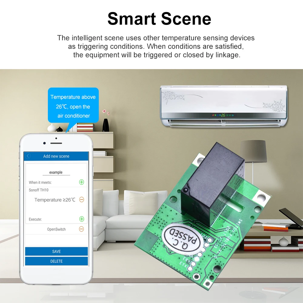* Умная сцена: срабатывает ВКЛ/ВЫКЛ по температуре, гул или другим условиям окружающей среды от датчика.