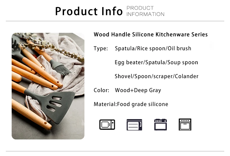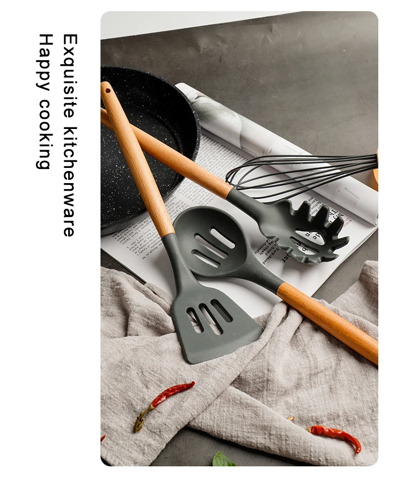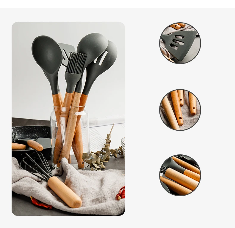 Силиконовая кухонная утварь, кухонная утварь, бамбуковые деревянные ручки, инструмент для приготовления пищи, щипцы, лопатка, ложка для антипригарной посуды