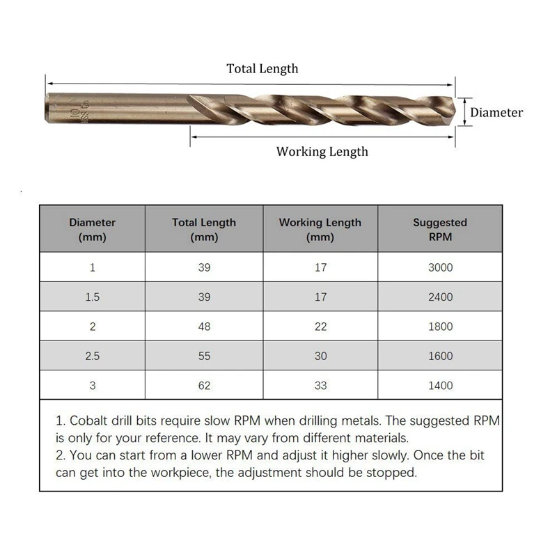 50 шт. В комплект входят 50 шт. метрических Сверл Из кобальтовой стали M35: 1 мм, 1,5 мм, 2 мм, 2,5 мм, М, 10 шт. каждого размера.
