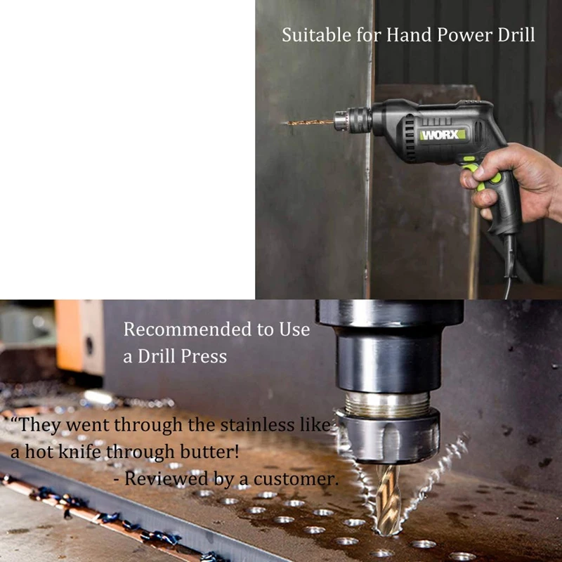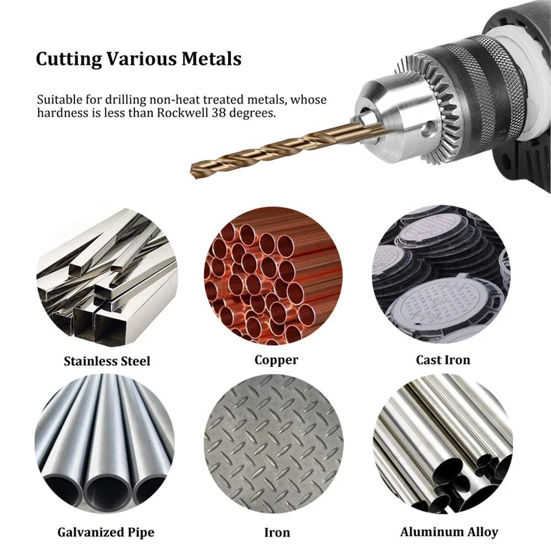 Этот набор сверл из кобальтовой стали M35 особенно успешен в резке твердых металлов, таких как нержавеющая сталь и чугун, хотя они также могут быть использованы для более мягких материалов.