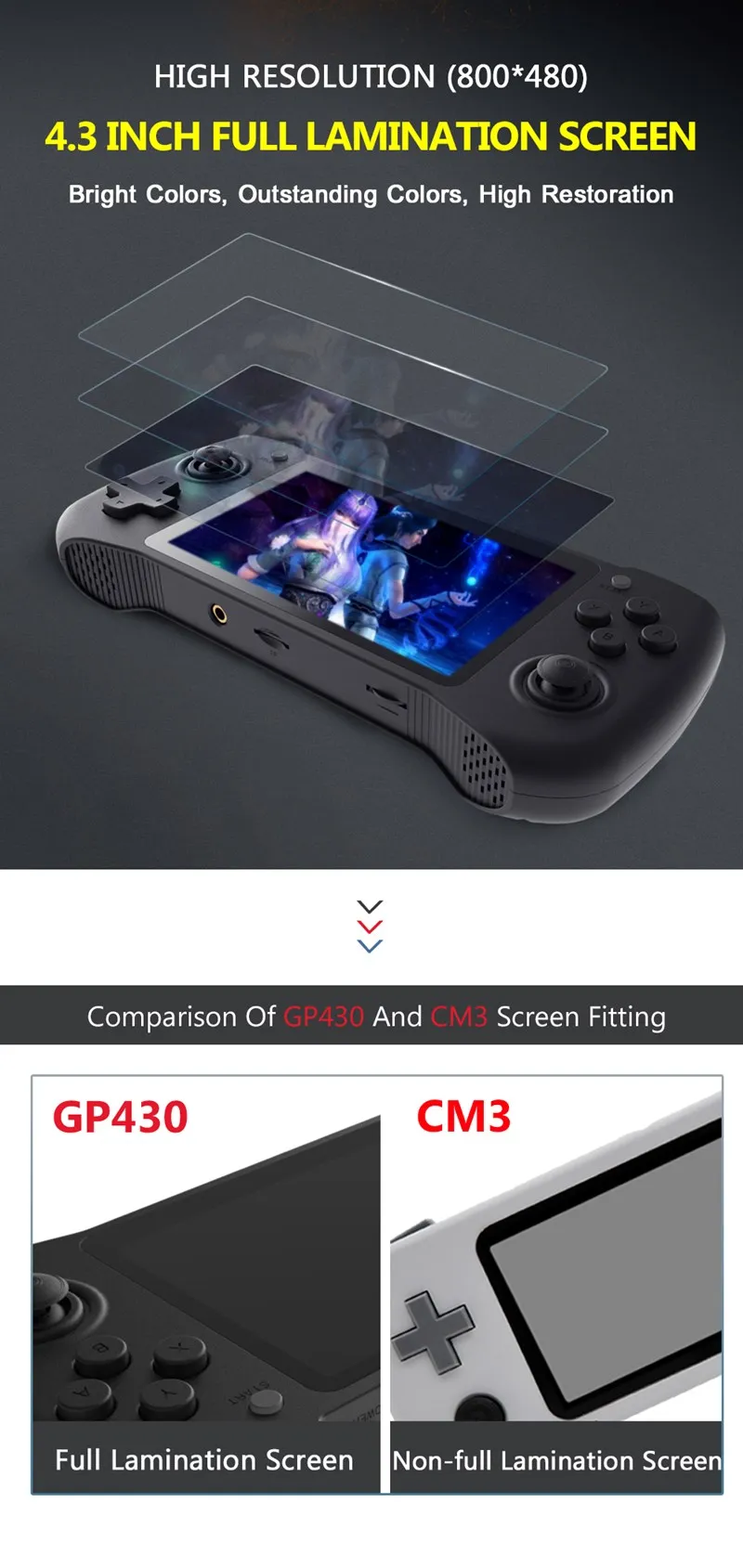 Форма для GP430 была разработана эргономичной. Во время игр, которые позволяют вам чувствовать себя комфортно. HD 4,3 дюймов полное ламинирование IPS Экран, полный просмотр 170 °-170 °, с высоким разрешением (800*480). Подходит для двух джойстиков PSV2000. Стереозвук, двухполяризационные динамики. Принять мощный двигатель турбовентилятора. 5000 мАч литиевая батарея.