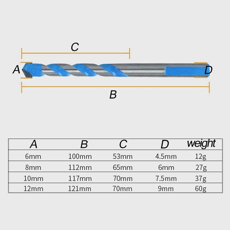 4 размера: сверло для кладки с 4 различными размерами размера s, 4x6 мм (1/4 дюйма), 2x8 мм (5/16 дюйма), 2x10 мм (3/8 дюйма), 2x12 мм (1/2 дюйма), различные размеры s для различного использования