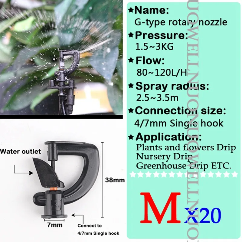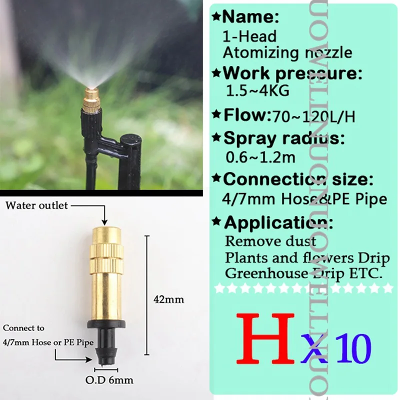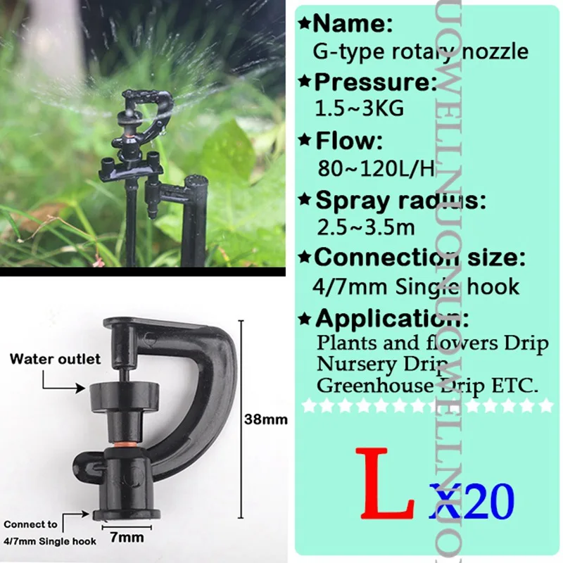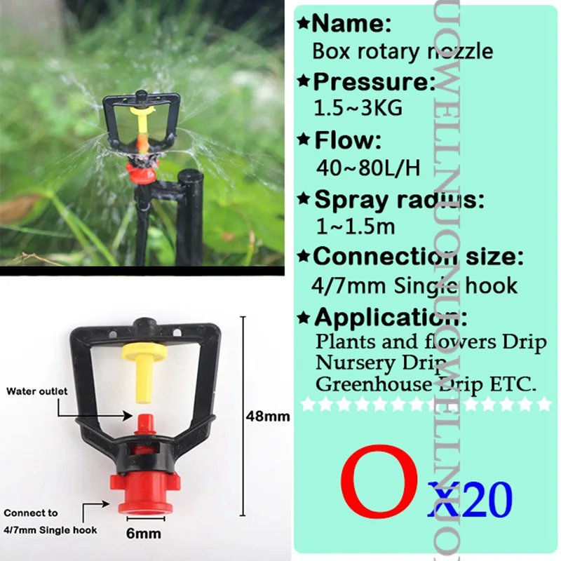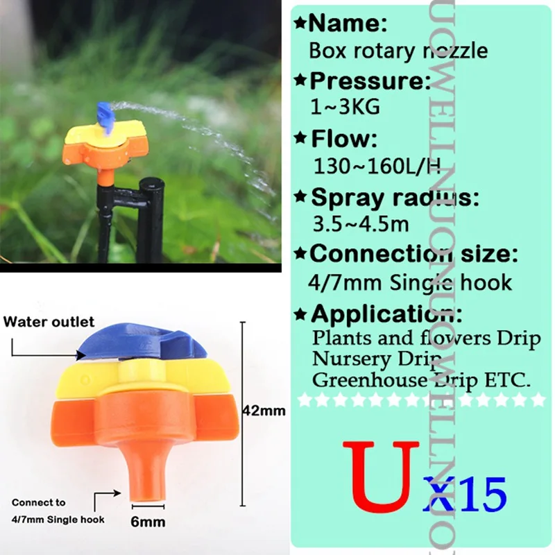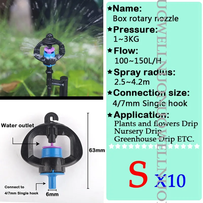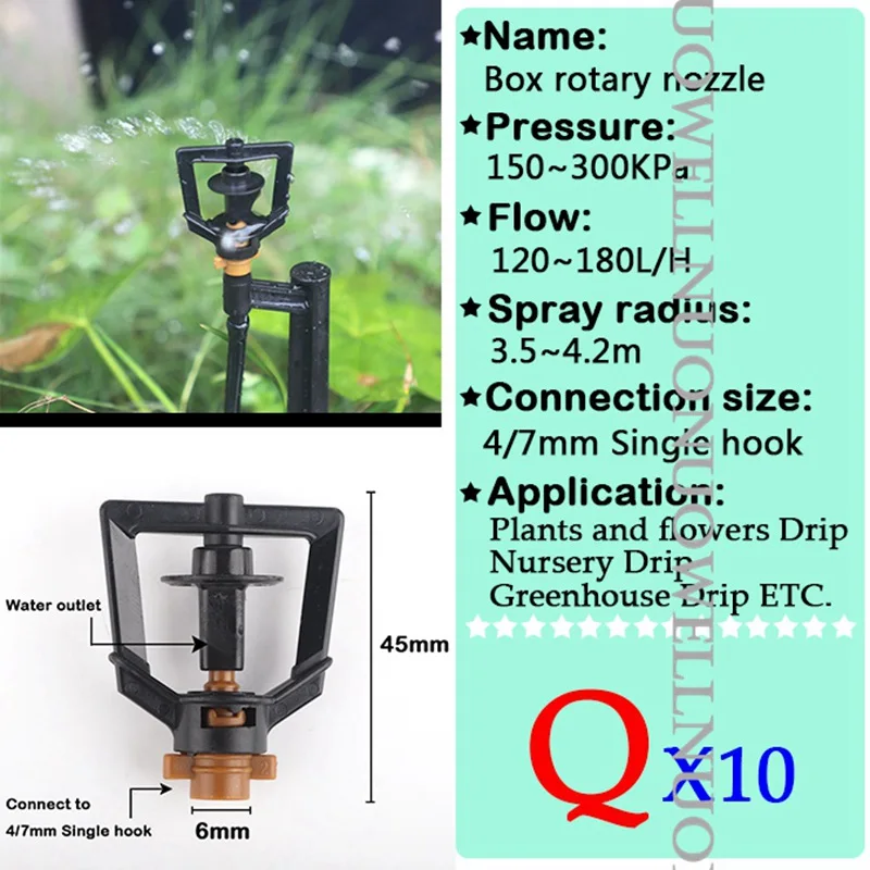 -Наименование: форсунки -Материал: PP пластик -Поток: 0 ~ 150 л/ч -Радиус распыления: 0 ~ 4,5 м -Рабочее давление: 1 ~ 3 кг -Применяется для: 4/7 мм одинарный крюк и PE труба -Применение: ①Орошение сада ②Фрукты дерево и овощи орошение ③ Капельное орошение в питомнике ④Удаление пыли и т. Д.