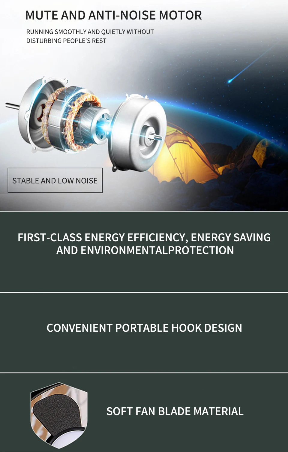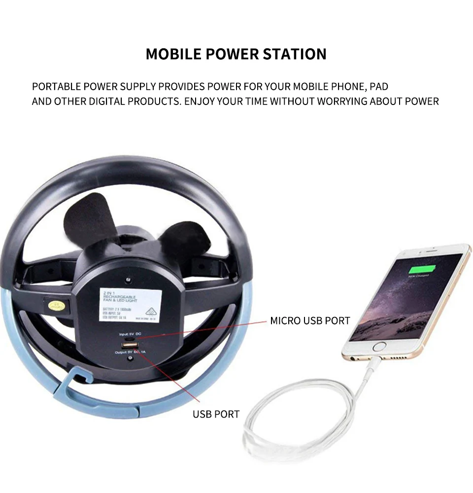 Параметры аккумулятора: 2x1800 мАч Характеристики ламп: 10 шт. 2835SMD 1,5 Вт Материал изделия: АБС-пластик Цвет изделия: черный Время зарядки: 4 часа, красный светильник и полная мощность, красный светильник всегда включен; Синий светильник включен, при зарядке телефона; Время работы: полностью заряженный может быть индивидуально горит в течение 48 часов или использовать вентилятор (низкая скорость) в течение 30 часов, вентилятор (высокая скорость) в течение 12 часов или использовать лампу + вентилятор (высокая скорость) В течение 9 часов.