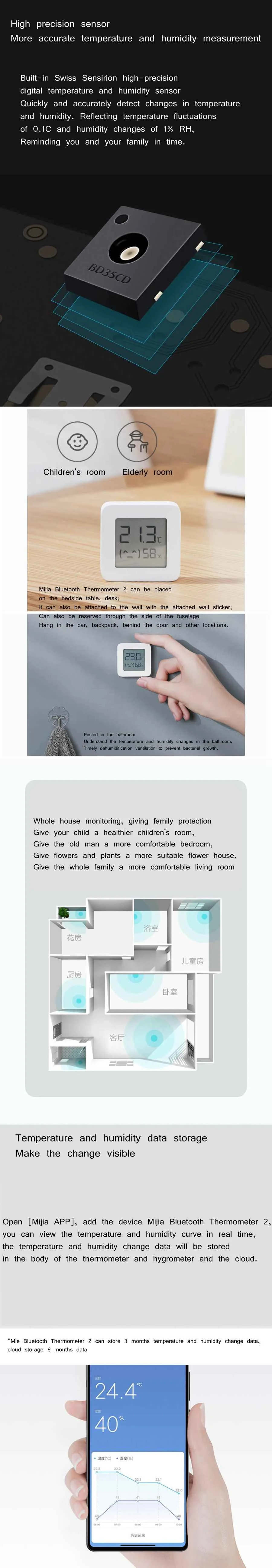 5. Встроенный усовершенствованный датчик чувствительности температуры и влажности, Точность температуры: 0,1 градуса, точность влажности: 0,1% относительной влажности