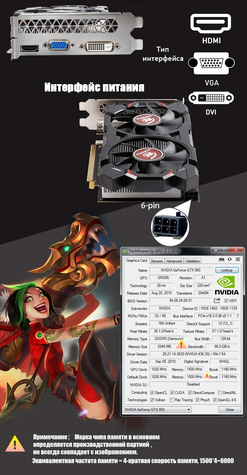 Модель продукта: GTX950 2GB Состояние: (100% полное тестирование перед поставкой) • 100% оригинальный чипсет GTX 950 • 100% новый • 100% натуральная 2 ГБ GDDR5 128 бит • Частота сердечника: 1026 МГц • Частота памяти: 6000 МГц • Тип интерфейса: PCI Express 2,0 X16 • Интерфейс ввода/вывода: HDMI + DVI + VGA • 3D API: DirectX 12 OpenGL 4,5 • Интерфейс питания: 6pin • Рекомендуемая мощность: 350 Вт или выше • Напоминание: Видеокарта GTX 950 требует питания мощностью 350 Вт • Поддержка технологии ускорения физики PhysX, технология NVIDIA GPU Boost 2,0, инструменты разгона GPU Tweak, поставка из супер сплава