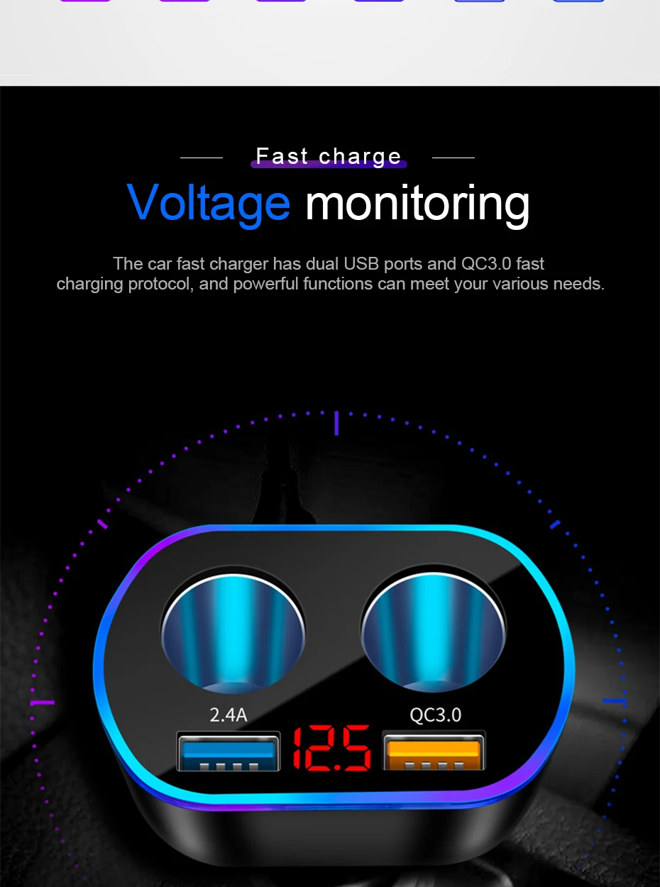 【 Автомобильный Разветвитель безопасности 】цифровой светодиодный дисплей с гнездом прикуривателя покажет значение напряжения при зарядке usb-устройств. Если значение напряжения превышает 24 В, предупреждение с миганием, зарядка будет остановлена.