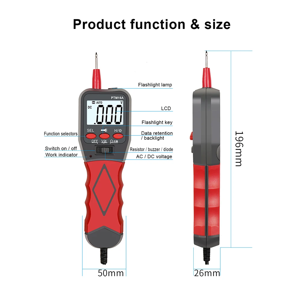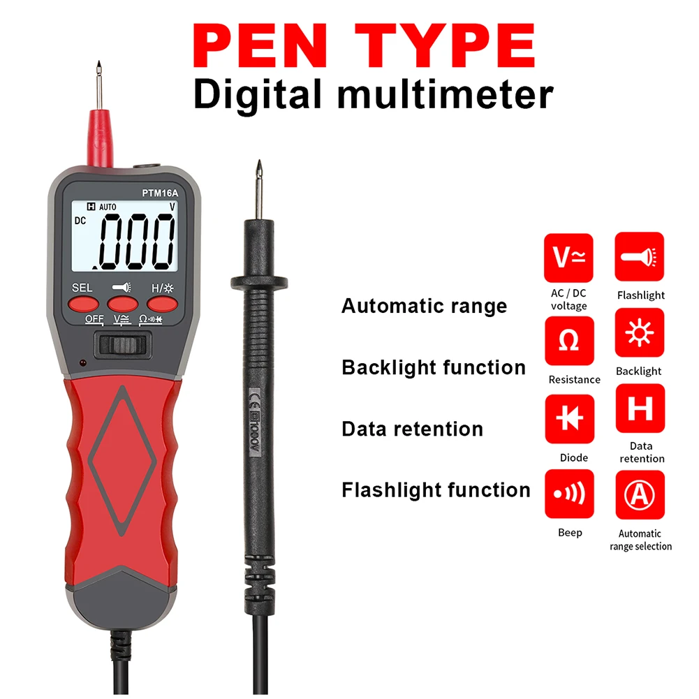 -Портативный мультиметр типа ручки, используемый для тестирования переменного тока и прямого тока напряжения, сопротивления, положительного напряжения диода и звуковой непрерывности.