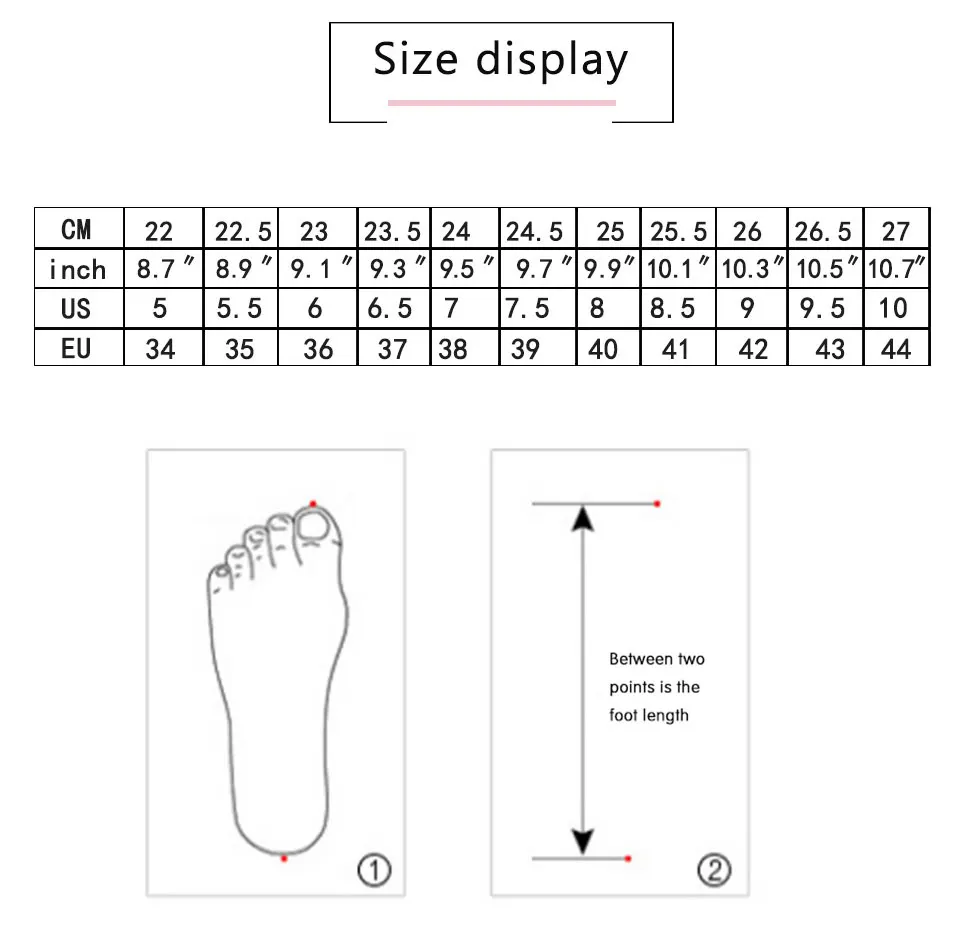 Размер: Пожалуйста, выберите размер в соответствии с длиной Вашей стопы. Если у вас полная и широкая стопа, пожалуйста, выберите больший размер. Если вы не можете убедиться в размере, пожалуйста, свяжитесь с нами. Внимание: 1. Ширина обуви нормальная, возможно, обувь не подходит для слишком тонкой или слишком толстой стопы. 2. Существует около 0,01 см-0,2 см Средний ошибки с помощью таблицы размеров. 3. Пожалуйста, измерьте длину стопы, как показано на рисунке: