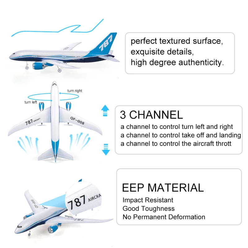 Этот самолет-масштабная модель Боинга 787 с изысканными деталями. Изготовлен из высококачественного EPP материала, обладает отличными характеристиками ударопрочности и хорошей прочностью. Его высокоэффективный комбинированный двигатель-аккумулятор и шестиосевой гироскоп обеспечивают стабильную борьбу, что делает его удобным для работы, даже если вы никогда не летали модель раньше. Мало того, что два типа руля для начинающих и профессионалов на выбор полностью соответствуют вашим требованиям. Отличный подарок для детей, студентов и любителей RC. При наличии независимых компонентов самолета и руководства пользователя, интересно собрать их руками. Не сомневайтесь слишком долго, чтобы пропустить это.