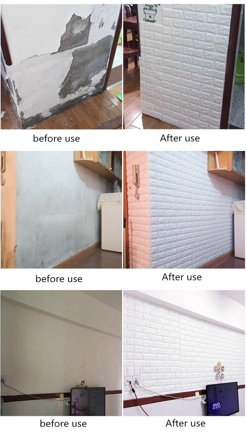 Характеристики: 1: трехмерная декоративная мягкая пена, защита от столкновений для детей, забота о вашей семье. 2: Безопасность и защита окружающей среды, нетоксичный запах, подходит для семейного безопасного домашнего пространства. 3: Реалистичный, естественный эффект кирпичного узора, простой и современный стиль. 4: Бесплатный DIY, простой самоклеящийся дизайн, установка, повседневный коллаж, произвольный крой. 5: сравнение обоев с улучшенным эффектом шумоподавления.