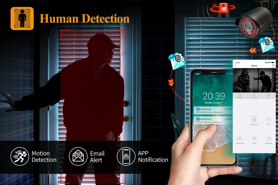 Когда кто-то ворвется в область съемки, камера сделает сигнал тревоги и сообщения тревоги будут подталкиваться к вашему телефону приложение, легкая установка в приложении.
