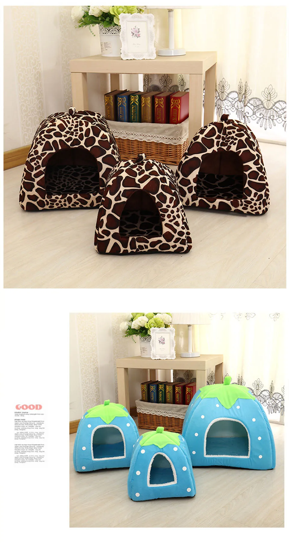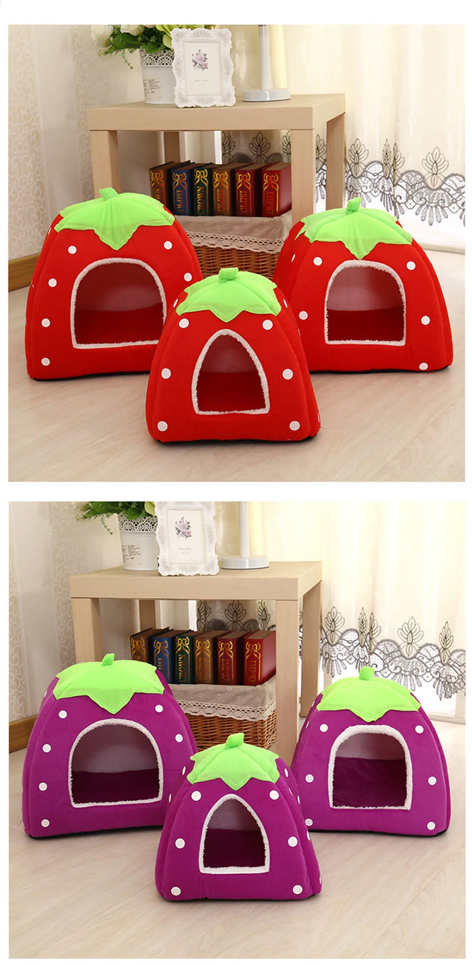1. Made of high quality short plush, thick warm fabric 2. Adopt soft warm cotton cloth on the wall, washable and durable 3. With breathable, moisture-proof non-woven bottom 4. Create a comfortable bed for your pet's healthy sleeping and rest 5. It is super soft and warm, so your pet will feel happy when in it 6. Best bedroom or resting place for your pet dog or cat 7. Lovely strawberry style, simple but good-looking Specifications: Condition: Brand New Color:Red/Leopard Material:Cotton velveteen material within and outside printing short plush material, backing polyester, plastic cloth. Size(cm): SIZE Out Diameter Inner Diameter Door hole Fit Fpr Pet S 26x26x28cm 24x24x26cm 13.5x11cm 1kg M 31x31x33cm 29x29x31cm 16.5x15cm 2kg L 36x36x38cm 34x34x36cm 17.5x17.5cm 3kg XL 43x43x45cm 40x40x42cm 19x21cm 5.5kg size(inch) SIZE Out Diameter Inner Diameter Door hole Fit Fpr Pet S 10.24x10.24x11.0in 13.5x11cm/5.31x4.33in 9.45x9.45x10.24in 1kg M 12.2x12.2x12.99in 16.5x15cm/6.5x5.91in 11.42x11.42x12.2in 2kg L 14.17x14.17x14.96in 17.5x17.5cm/6.89x6.89in 13.39x13.39x14.17in 3kg XL 16.93x16.93x17.72in 19x21cm/7.48x8.27in 15.75x15.75x16.54in 5.5kg Packages: 1 x Strawberry Pet Nest