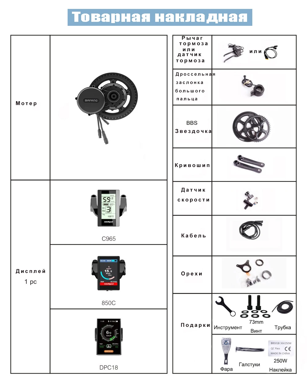Подарки: экипажи 73 мм * 1, трубка * 1, инструмент * 1, стяжки * 1,250 Вт * 1, фара * 1