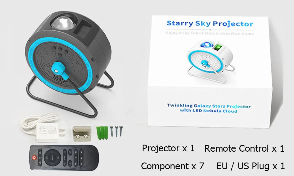 1. Название: лазерный проектор ночной Светильник 2. Батарея: батарея AAA (не входит в комплект) 3. Разъем (питание) и дистанционное управление. 4. Вход питания: AC110-240V 5. Размер Ночной светильник: 6x6x2,7 дюйма 6. Диаметр: 5,9 дюйма 7. Материал: АБС-пластик 8. 7 цветов смешивают проекции, всего 8 эффектов. 9. Время: 30 минут, 60 минут, 120 минут 10. Bluetooth-динамик 11. Поворот на 360 ° 12. Предполагаемая площадь: 18 - 24 ㎡ 13. Предполагаемое расстояние: 98 - 157 дюймов