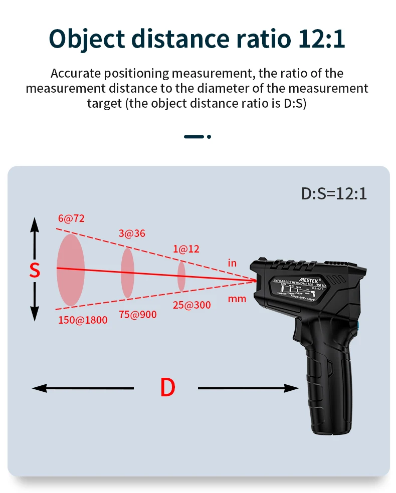 Точное измерение местоположения, отношение Расстояния измерения к диаметру цели измерения (Отношение расстояния объекта D:S)