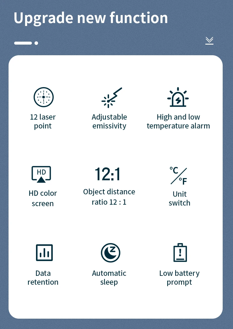 12 лазерных точек, регулируемое излучение, сигнализация с высокой и низкой температурой, сигнализация с высокой и низкой температурой, соотношение расстояния объекта 12 : 1, переключатель блока, хранение данных, автоматический сон, подсказка с низкой батареей