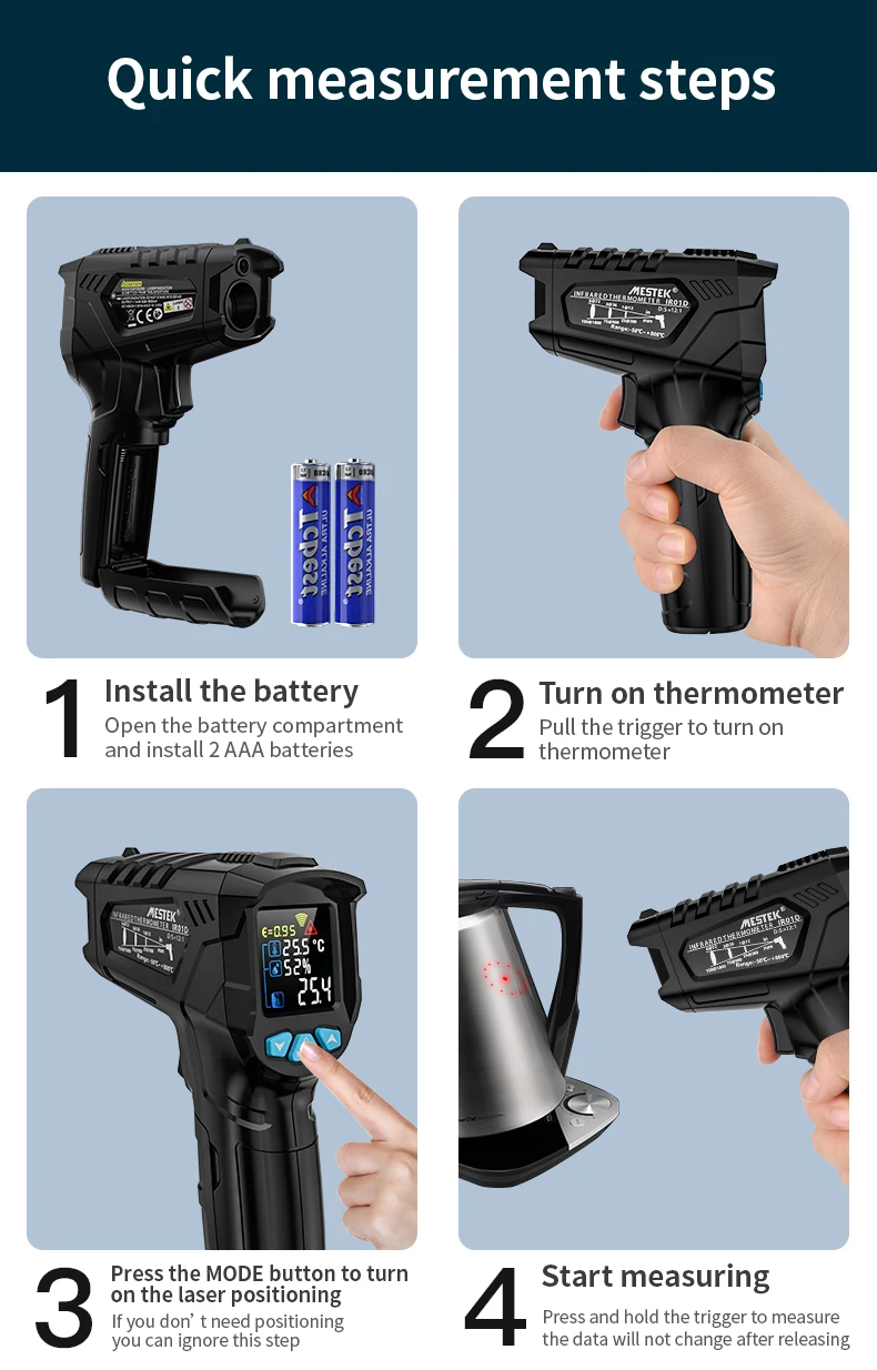 1. Установите батарею 2. Включите термометр 3. Нажмите кнопку MODE, чтобы включить лазерное позиционирование 4. Начать измерение