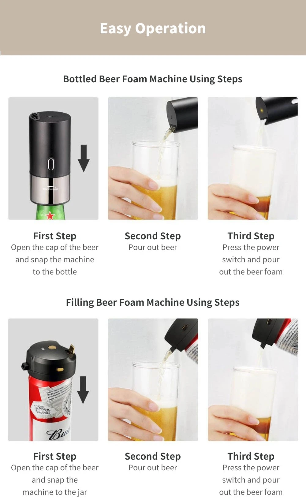 -Шаги по наполнению машины для производства пенопласта для пива: Шаг 1: Откройте крышку для пивной бутылки и положите машину на бутылку.Шаг 2: Налейте жидкость для пива.Шаг 3: нажмите переключатель и Налейте пену для пива.