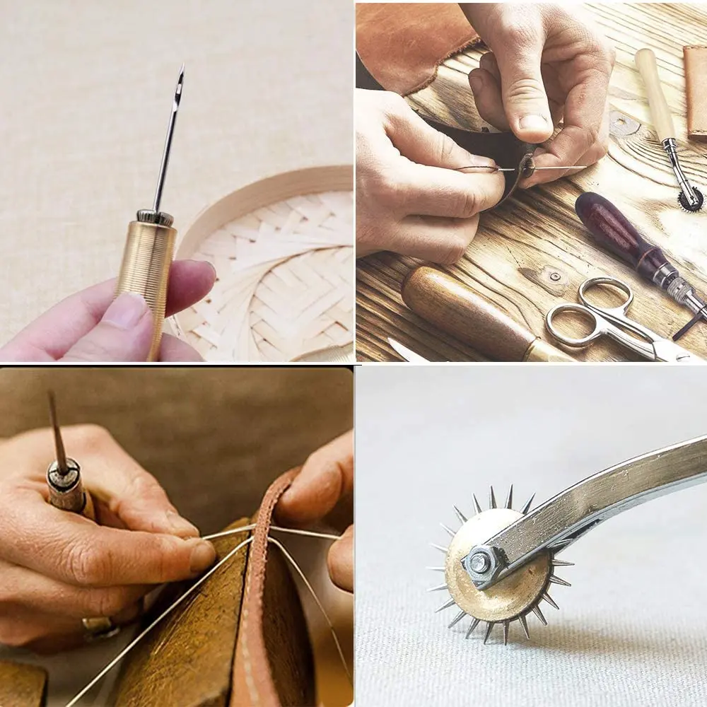 1 x медное Шило 1x7 в 1 регулируемая груша 1 х нож для резки кожи 1 x awl 1 х Дырокол 1 х широкий край кожаной груши 1 x кожаное колесо 0verstitch 4 мм 1 x кожаная прострочка 2 мм 1 роторный резак 1 х кожаный Прорезыватель 1 ножницы 1 x A4 кожа 1 x A5 кожа 1 х A4 кожаный коврик 3 x пилки для ногтей 3 х шерстяные мазни 2 x пальчиковые Коты 2 х Дерево полировальные 1 х наперсток 1 x воск 3 х u v groover 80 наборов кожаных заклепок 7 кожаных игл 1 шт. прямая обивочная игла 1 шт. паруса иглы для шитья холста и жалюзи 1 шт. игла для мешков 1 шт. изогнутая игла для матраса 1 шт. ковровая игла для шитья и тяжелой ткани 1 шт. игла glover для шитья кожи и меха 1 шт. изогнутый матрас игла для шитья обивки и матраса 5 x вощеная нить (55 ярдов на катушку, черный, кофейный, светильник, кофейный, черный, натуральный цвет)